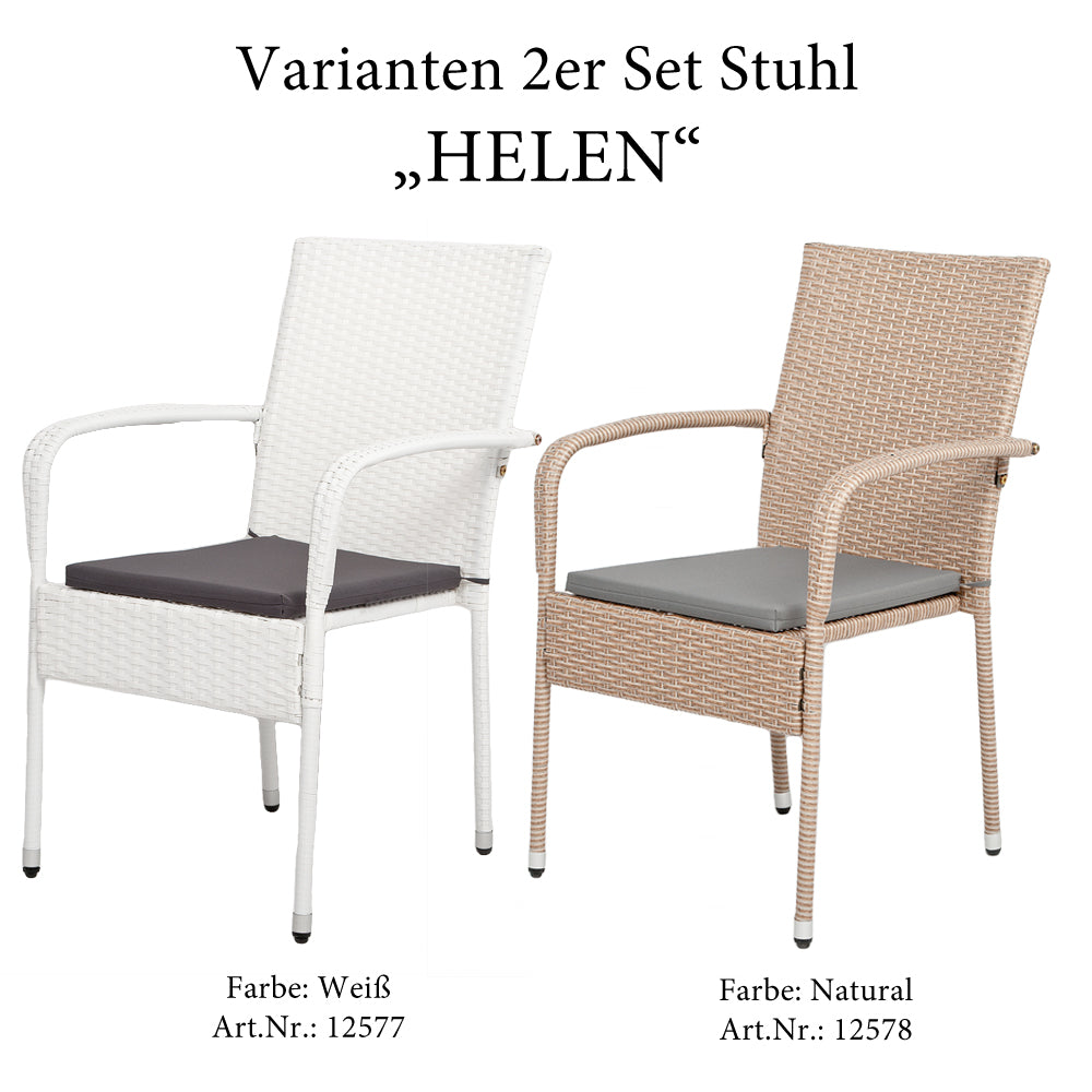 Das 2tlg. Set HELEN, bestehend aus zwei Stühlen und zwei Auflagen, lädt zu gemütlichen Verweilen im Grünen ein. Die robusten Möbel sind aus witterungsbeständigem Kunststoffgeflecht (Polyrattan) und versprechen somit eine lange Lebensdauer und pflegeleichte Handhabung.