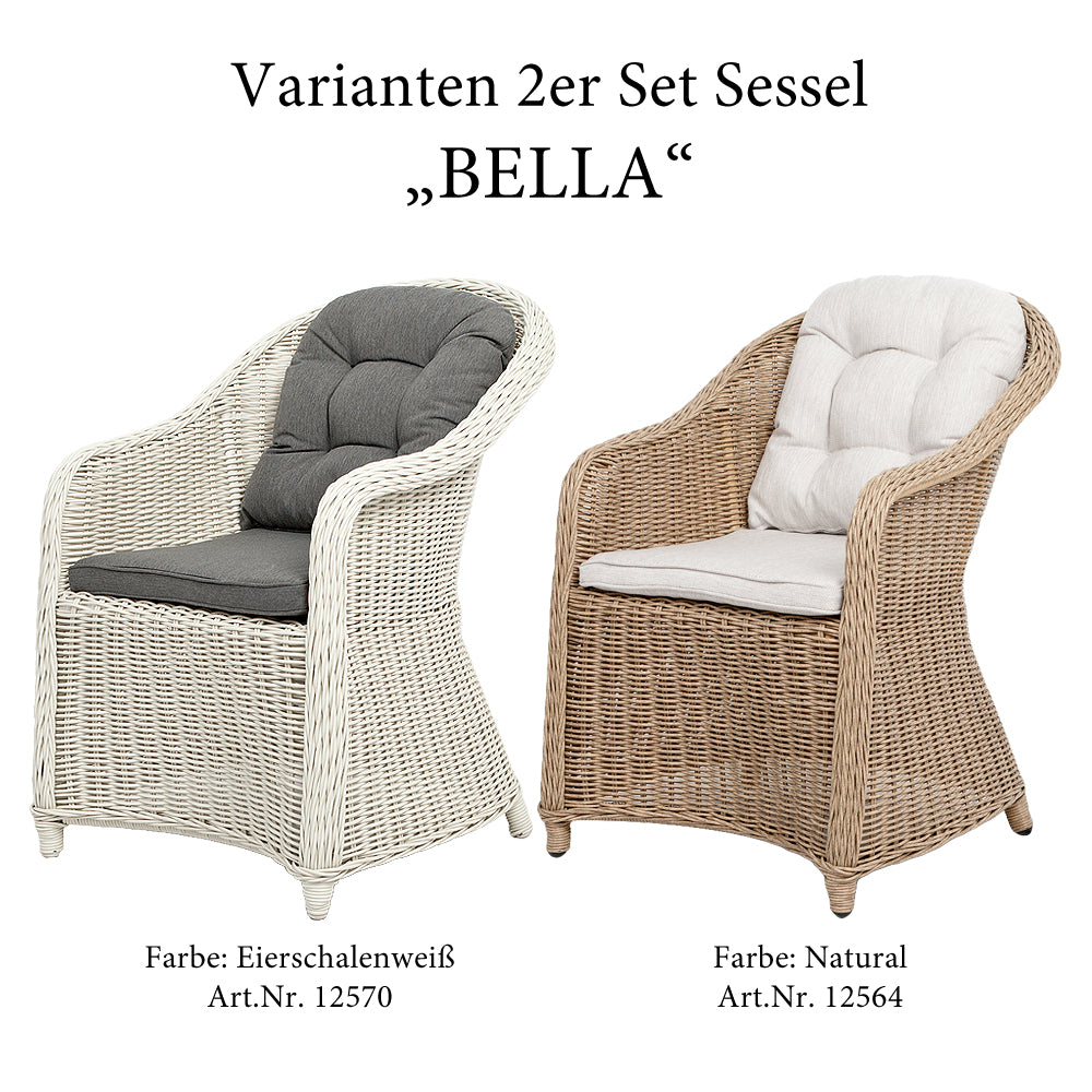 Der bequeme Lounge Sessel BELLA - hier als 2er Set - lädt zu gemütlichen Verweilen z.B. im Garten, dem Balkon oder auf der Terrasse ein. Das Grundgestell besteht aus rostfreiem Aluminium, dadurch ist neben der nötigen Stabilität auch ein geringes Gesamtgewicht gewährleistet. Das Geflecht ist aus rundem Polyrattan. Im Gegensatz zu dem meist verwendeten flachen Rattan ist das runde Polyrattan widerstandsfähiger. Die passenden wasserabweisenden Sitzauflagen und Kissen sind inklusive und rundes das stimmige Gesamtdesign ab. Passend dazu finden Sie in unserem Online-Shop noch weitere Artikel aus der BELLA Serie.