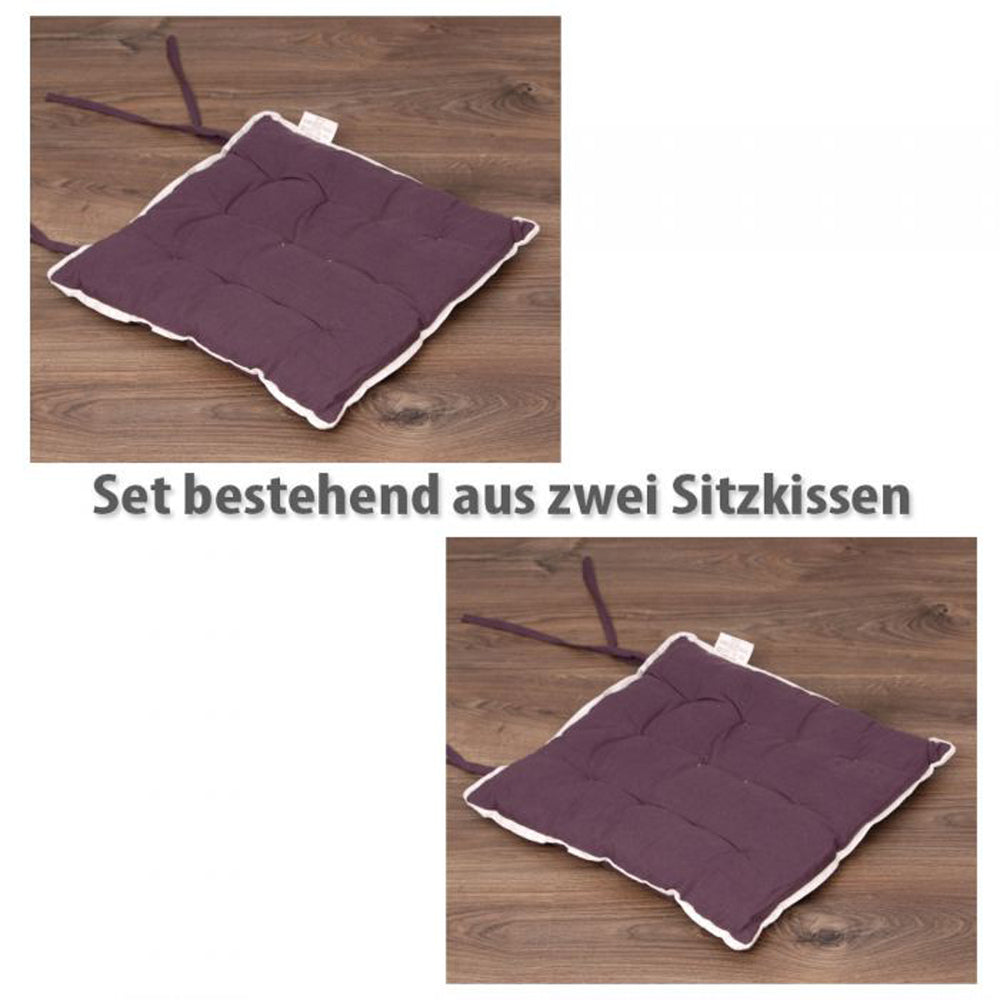 2er Set Sitzkissen MAX. Die Sitzkissen MAX, hier im farbenfrohen Violett, eignen sich ideal für z.B. Balkon-, Gartenstühle und Sitzbänke. Die angenähten Befestigungsschnüre verhindert ein Verrutschen des Kissens und gewährlichsten einen sicheren Halt. Die angenehm weiche Polsterung sorgt für Bequemlichkeit.