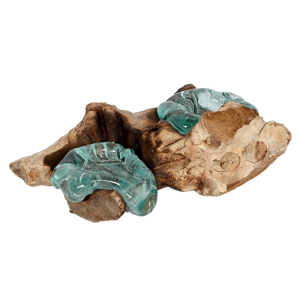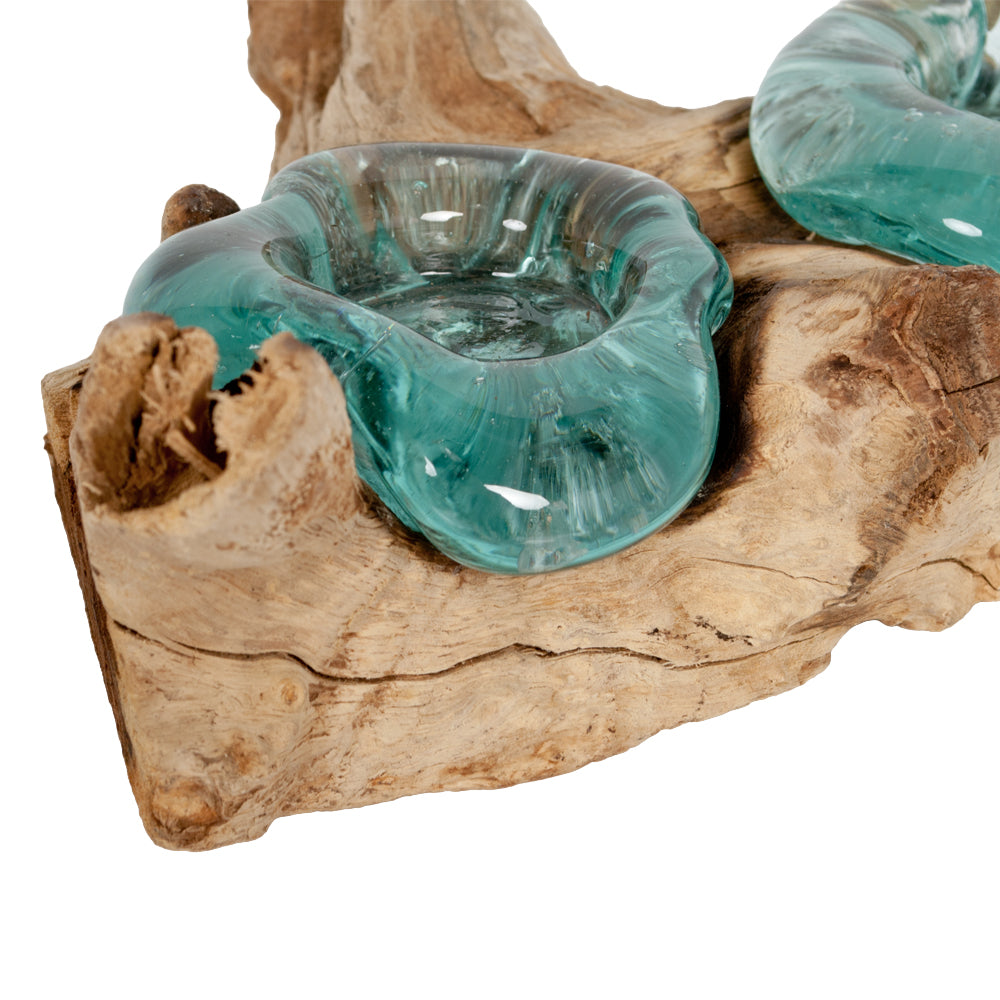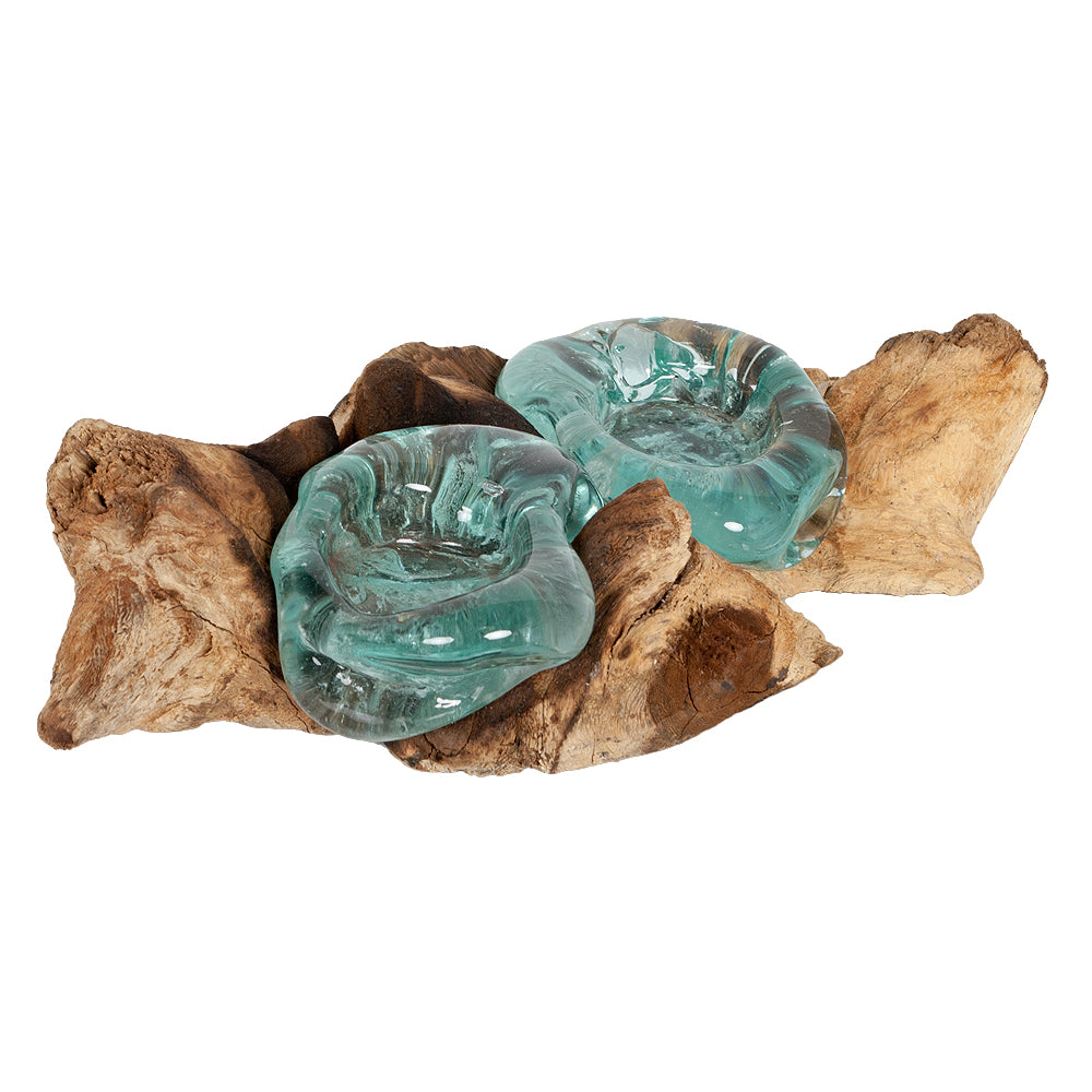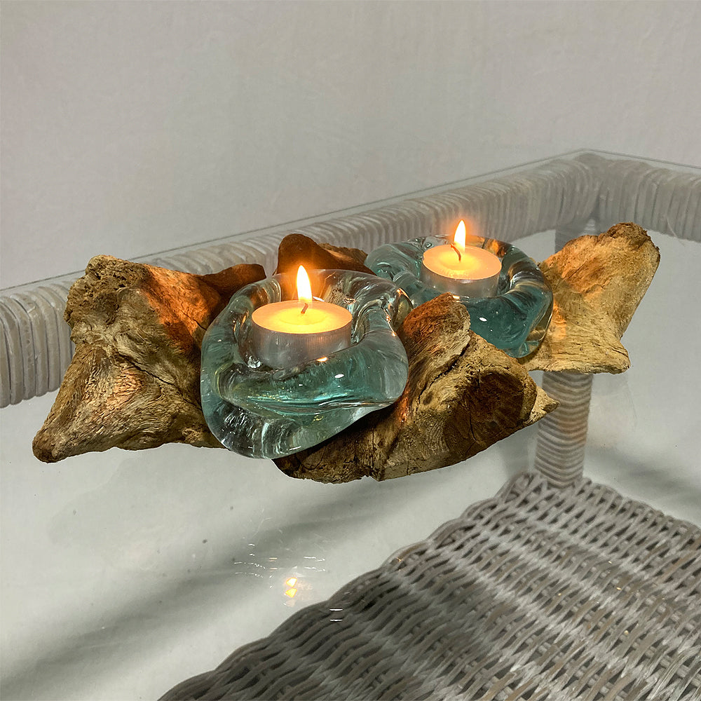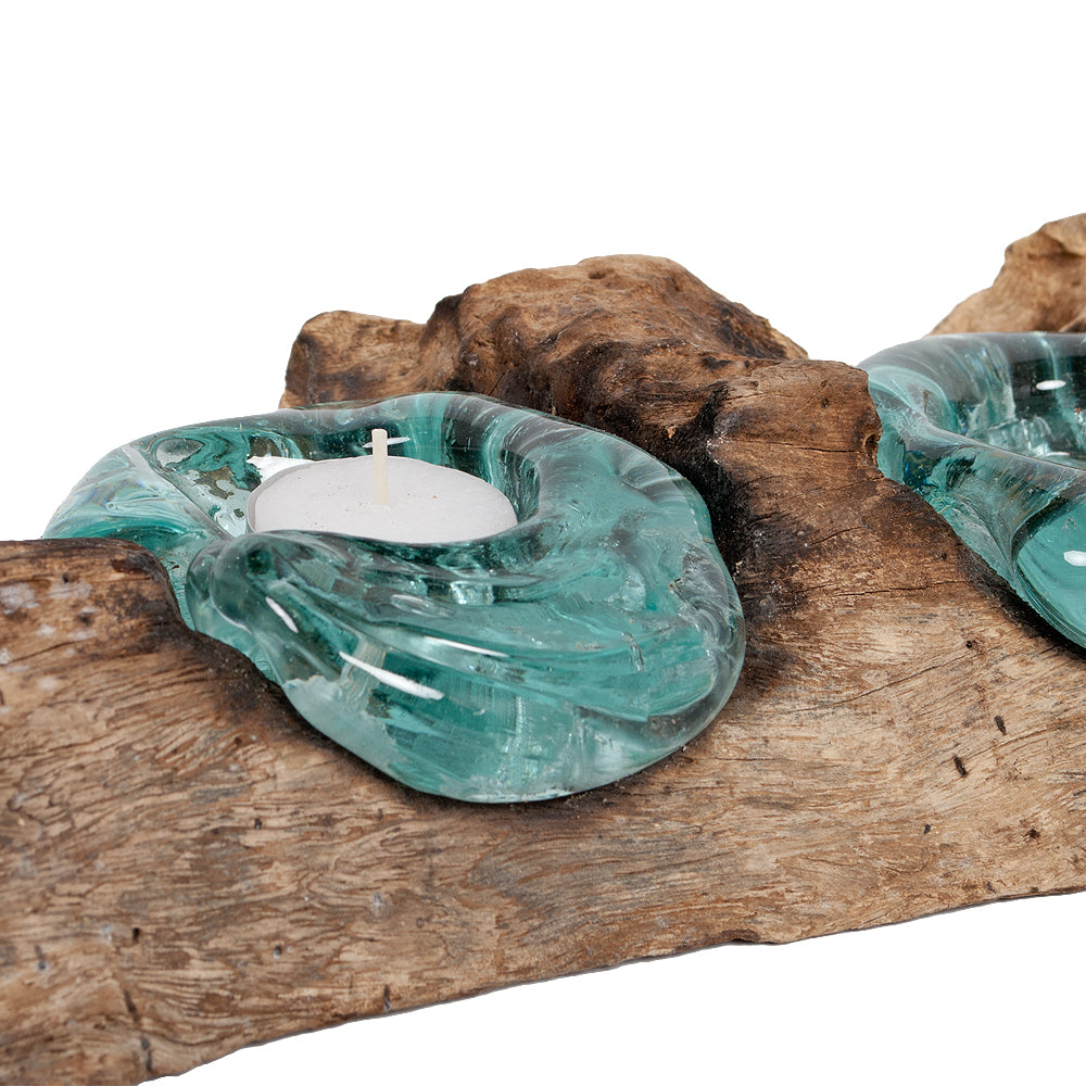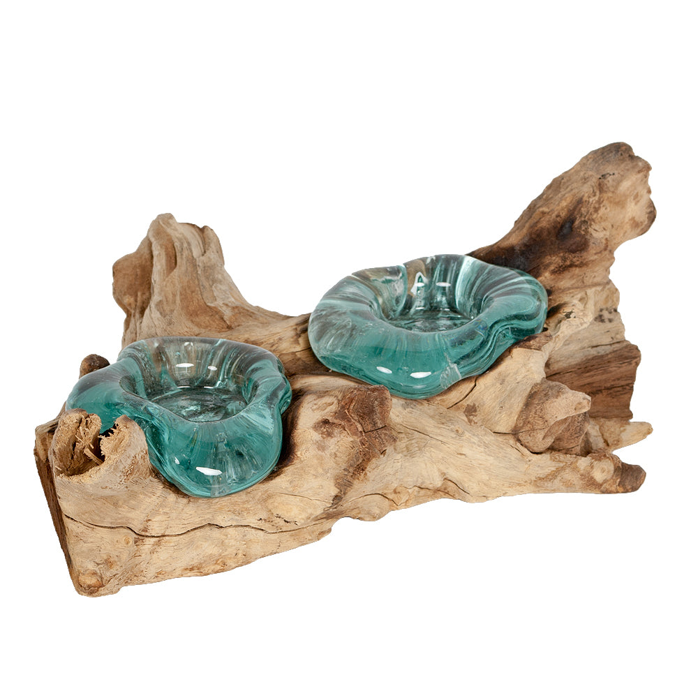 Dieser außergewöhnliche 2er-Teelichthalter DROP aus recyceltem Holz zeichnet sich durch seine absolute Individualität aus. Jeder dieser Artikel ist unterschiedlich geformt und ausgearbeitet. Das Glas wird traditionell mundgeblasen und über das Holzstück laufen gelassen. Ein absolutes Unikat in Handarbeit gefertigt.