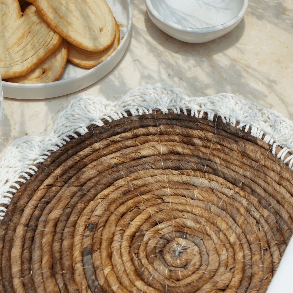 Die organische Struktur des Seegrases bringt Lebendigkeit ins Arrangement, während der umlaufende Baumwollrand in Makramee-Optik für eine weiche, textile Note sorgt. So entsteht ein harmonischer Kontrast zwischen rustikaler Naturfaser und feiner Handarbeit. PLACE passt sowohl zu modernen Holztischen als auch zu Stein-, Beton- oder Glastischen und lässt sich vielseitig kombinieren – von minimalistisch bis mediterran.
