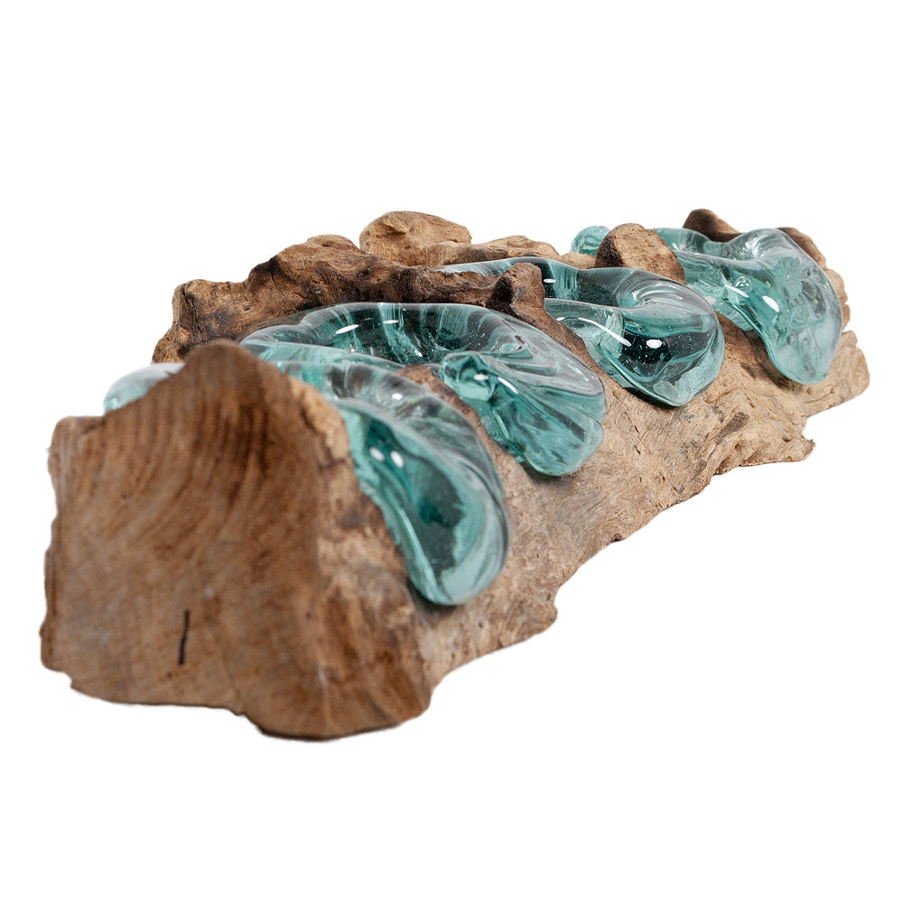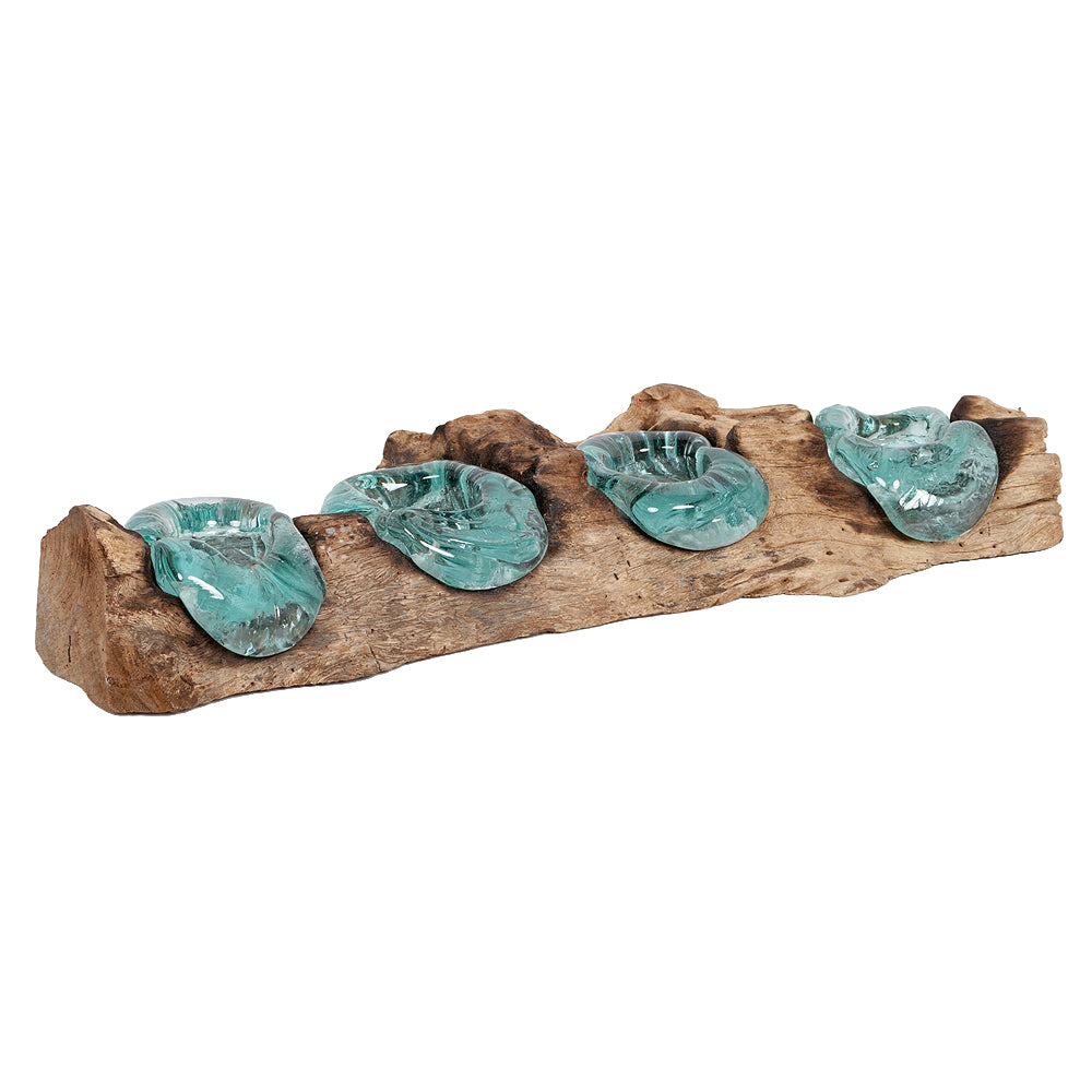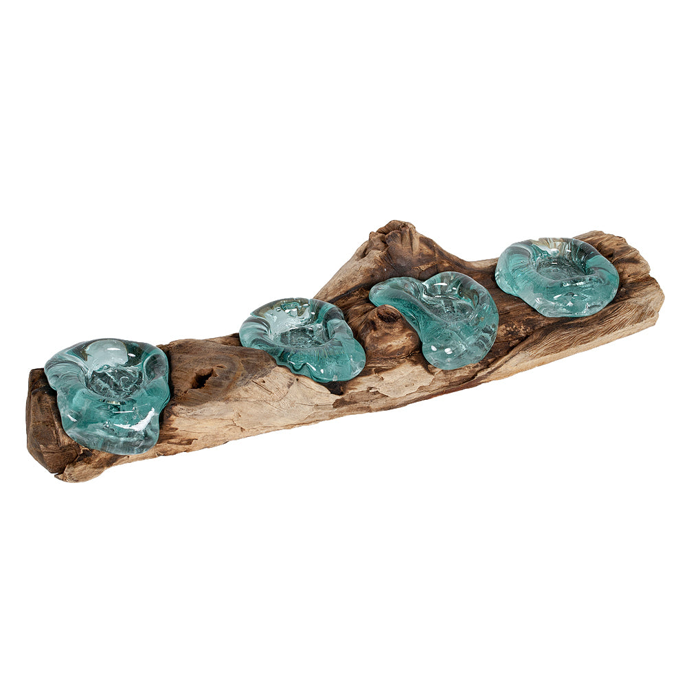 Dieser außergewöhnliche 4er-Teelichthalter DROP aus recyceltem Holz zeichnet sich durch seine absolute Individualität aus. Jeder dieser Artikel ist unterschiedlich geformt und ausgearbeitet. Das Glas wird traditionell mundgeblasen und über das Holzstück laufen gelassen. Ein absolutes Unikat in Handarbeit gefertigt.