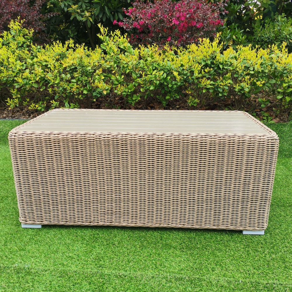 Die bequeme 4tlg. Sitzgruppe VITA-2er - bestehend aus zwei Lounge-Sesseln, einem 2er Lounge-Sofa und einem Couchtisch - lädt zu gemütlichen Verweilen z.B. im Garten, dem Balkon oder auf der Terrasse ein. Das Grundgestell besteht aus rostfreiem Aluminium, dadurch ist neben der nötigen Stabilität auch ein geringes Gesamtgewicht gewährleistet. Die Tischplatte ist aus Polywood in Plankenoptik, das Geflecht aus rundem Polyrattan. Im Gegensatz zu dem meist verwendeten flachen Rattan ist das runde Polyrattan widerstandsfähiger. Die passenden wasserabweisenden Sitzauflagen und Kissen sind inklusive und rundes das stimmige Gesamtdesign ab.