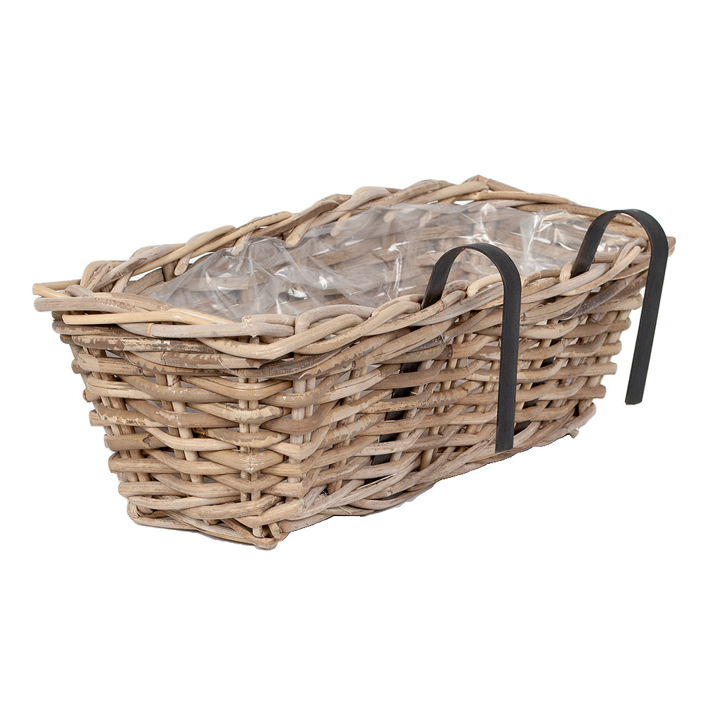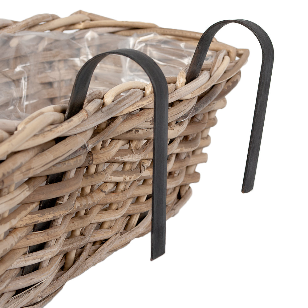 Hängekorb VERONA mit Kunststoff-Inlay. Handgeflochten aus besonders robustem Rattan (Kubu Grey) verschönert dieser Artikel jeden Balkon. Die beiden Haken ermöglichen das einfache Aufhängen am Geländer.