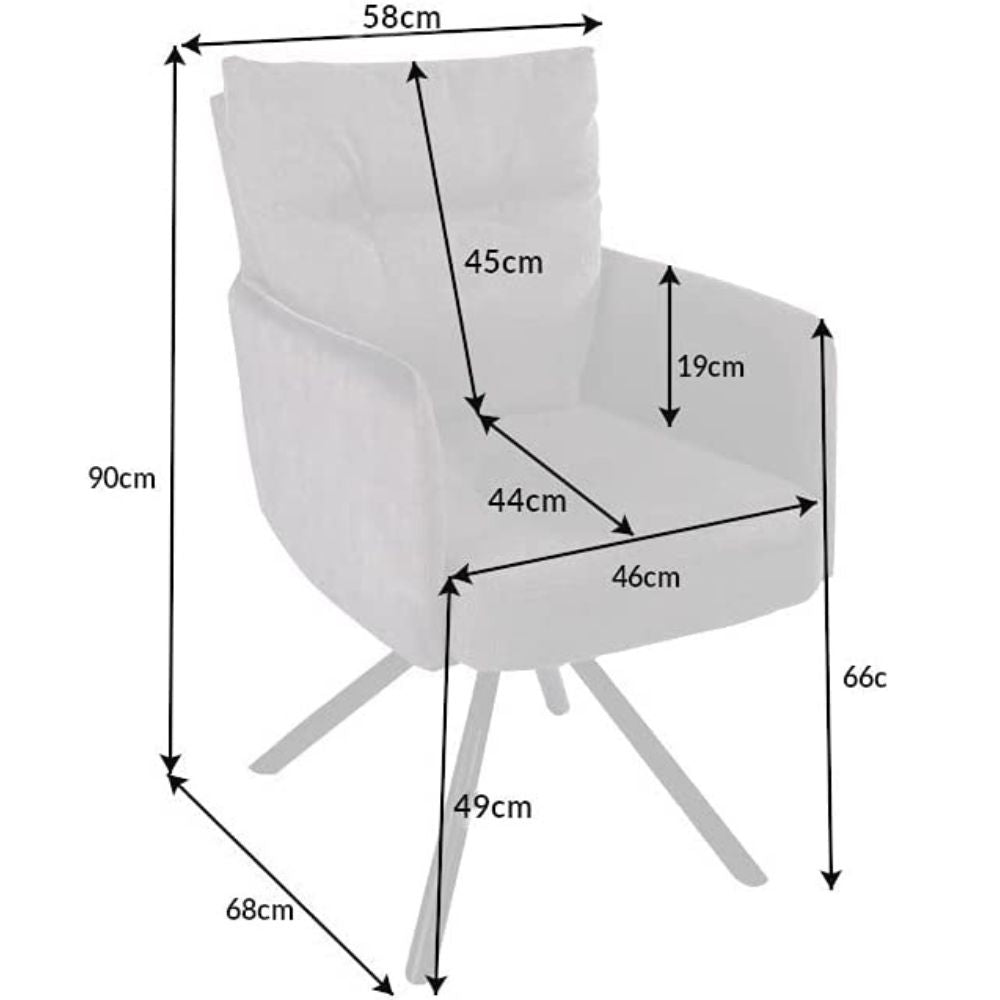 - Maße ca.: 58x90x68cm (BxHxT) - Sitzbreite 46cm - Sitzhöhe 49cm - Sitztiefe 44cm - Höhe Rückenlehne 45cm - Höhe Armlehne 19cm - Abstand Boden/Armlehne 66cm
