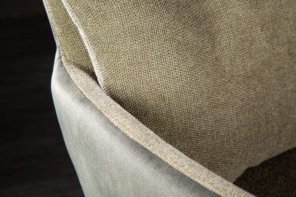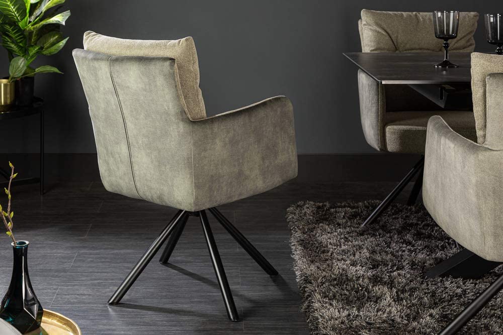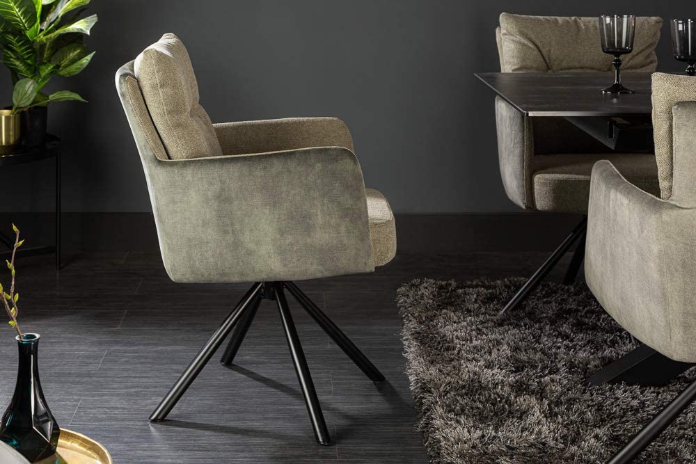 Gefertigt aus hochwertigen Materialien, verleiht der Stuhl in der Farbe Grün-Grau jedem Raum Wärme und Raffinesse. Das präzise Design betont jede Linie und Kontur des Stuhls, während die bequeme Polsterung und die Armlehnen für optimalen Komfort und Halt sorgen.