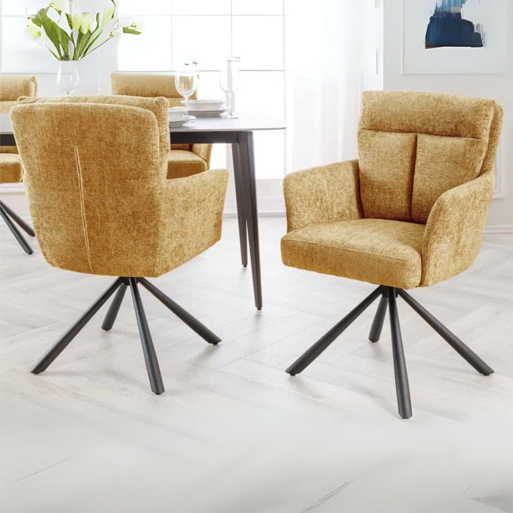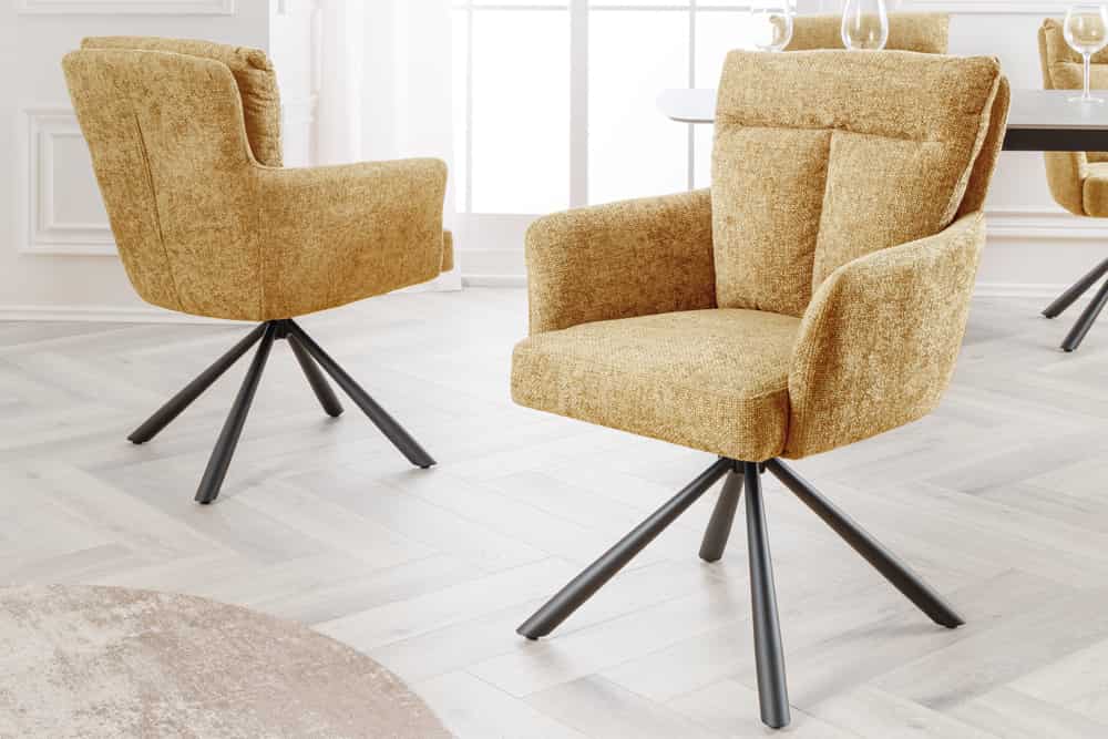 Lass Dich von der imposanten Erscheinung des CHARLES verzaubern. Die großzügige, um 360° drehbare Sitzschale (inkl. Rückschwingfunktion) umarmt Dich förmlich und lädt zum stundenlangen Verweilen ein. Der hochwertige Strukturstoff in Senfgelb fühlt sich nicht nur sehr gut an, sondern verleiht dem Stuhl auch eine elegante Optik, die Dein Zuhause aufwertet.