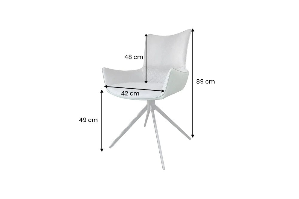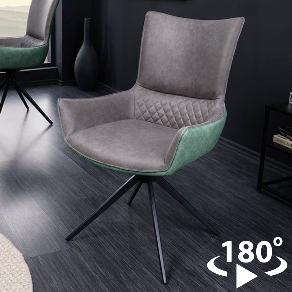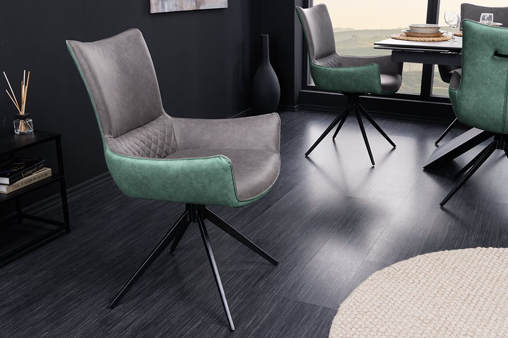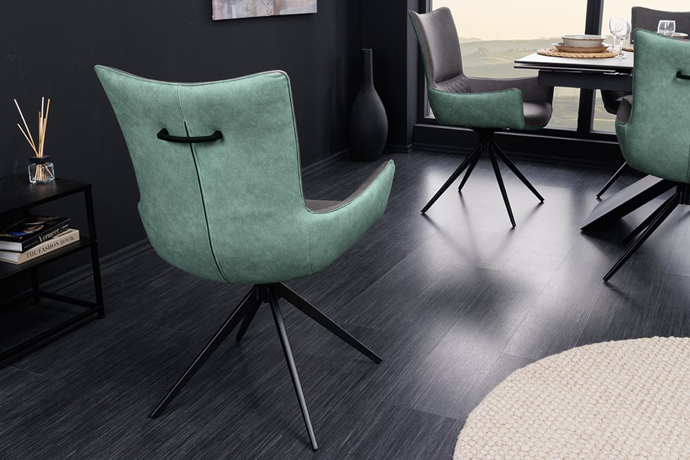 Der drehbare Design-Stuhl PILOT in Grau-Grün mit Armlehnen und schwarzen Metallbeinen ist ein modernes und stilvolles Möbelstück, das Deinem Zuhause einen Hauch von Eleganz verleiht. Dieser Stuhl ist nicht nur ästhetisch ansprechend, sondern auch äußerst funktional und bequem.