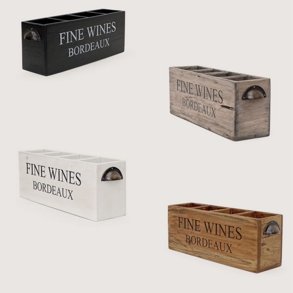 Ganz besondere Flaschenbox CHATEAU im dekorativen Vintage-Stil mit nostalgischem Aufdruck an den Seiten. Durch die praktische Größe eignet sich dieser Flaschenhalter auch für den kleinen Haushalt und läßt sich problemlos platzieren. Eine besonders schöne und dekorative Art, bis zu 4 Weinflaschen und/oder auch noch andere Utensilien unterzubringen.