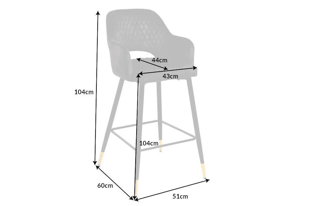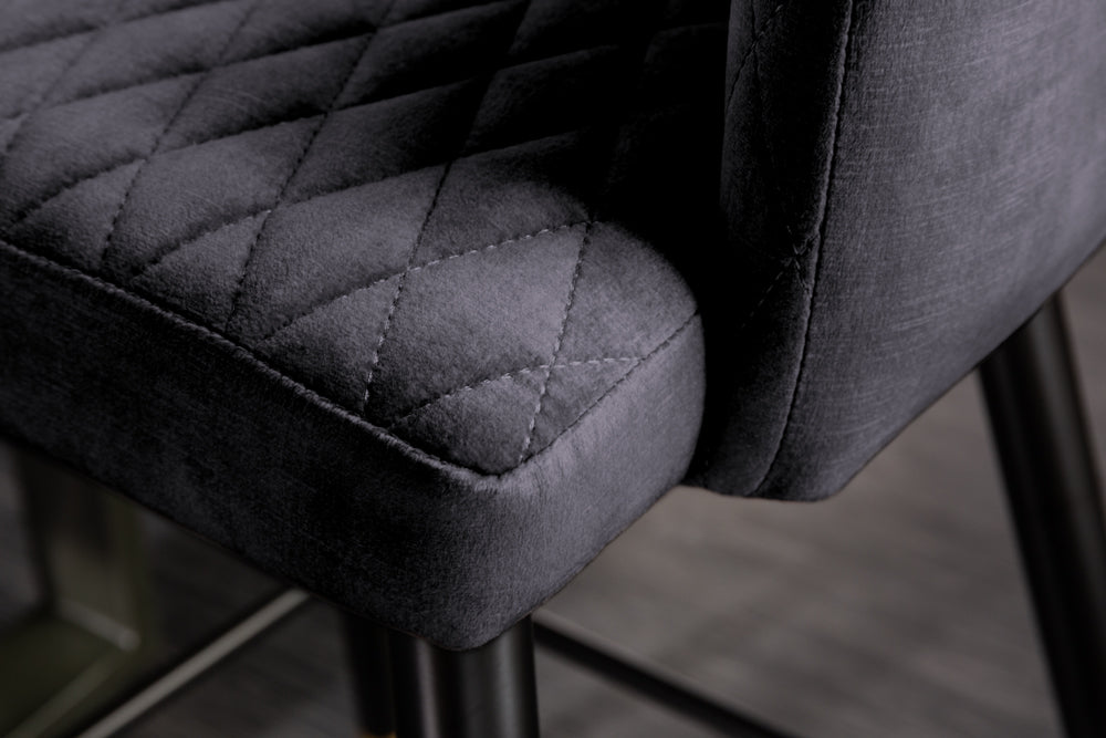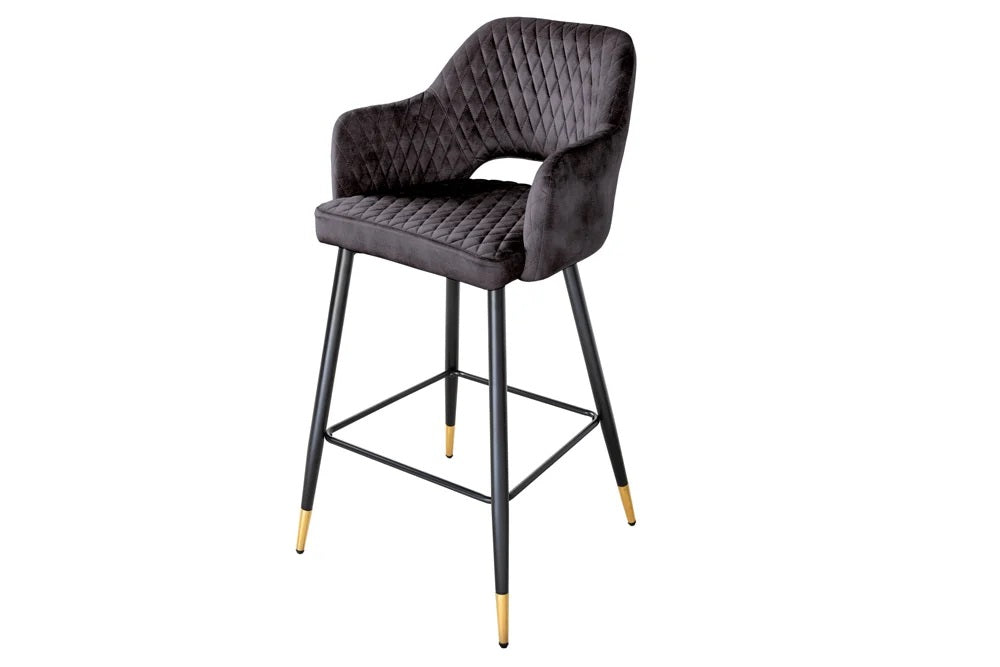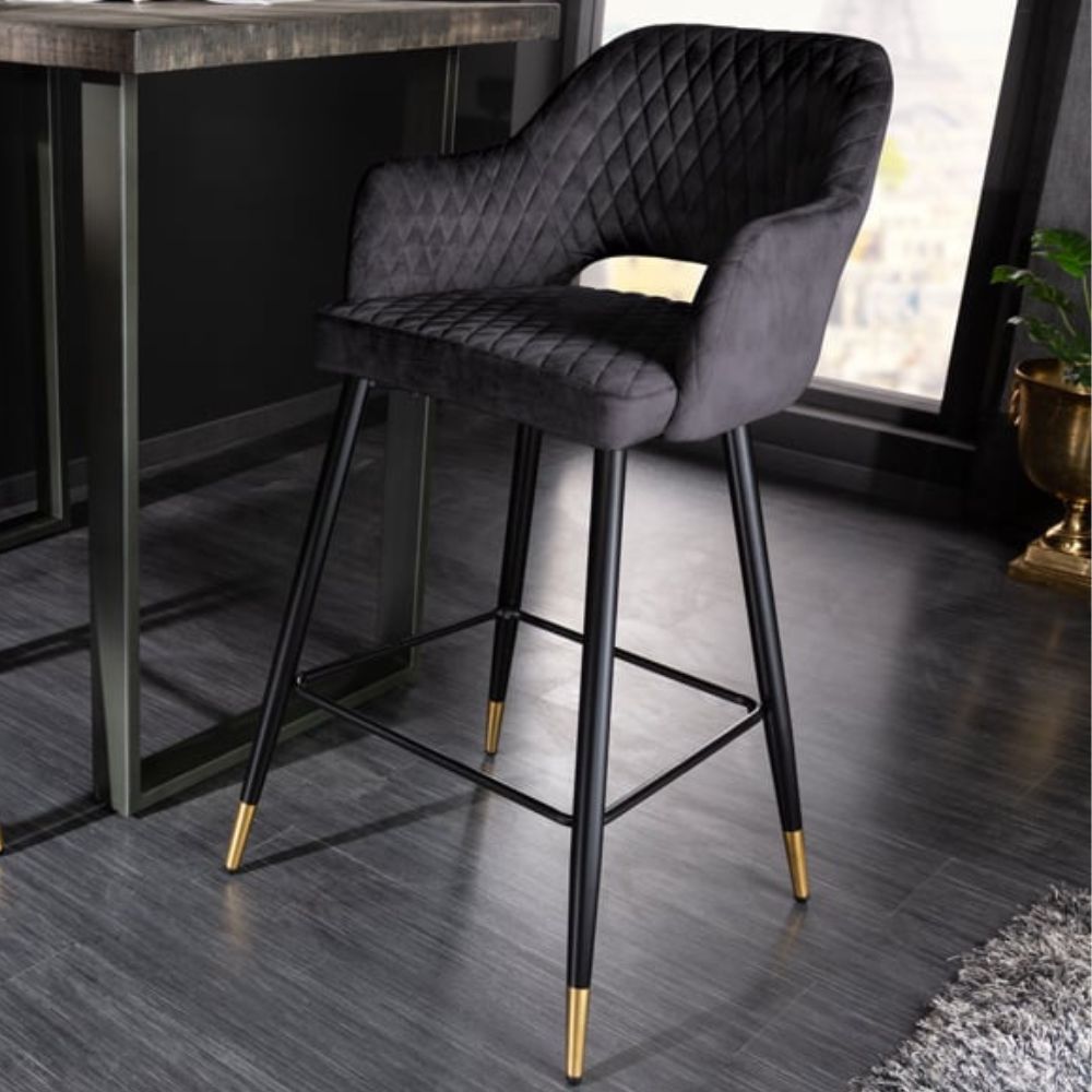 Dieser elegante Barhocker läßt sich toll mit vielen Einrichtungsstilen kombinieren. Der Bezug aus einem hochwertigen Samtstoff ist pflegeleicht und langlebig. Die Ziersteppung und die schwarzen Beine mit den goldenen Fußkappen verleihen einen Hauch von Extravganz.