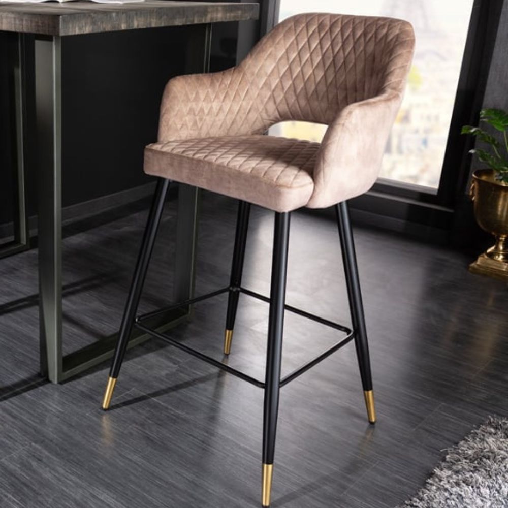 Dieser elegante Barhocker läßt sich toll mit vielen Einrichtungsstilen kombinieren. Der Bezug aus einem hochwertigen Samtstoff ist pflegeleicht und langlebig. Die Ziersteppung und die schwarzen Beine mit den goldenen Fußkappen verleihen einen Hauch von Extravganz.