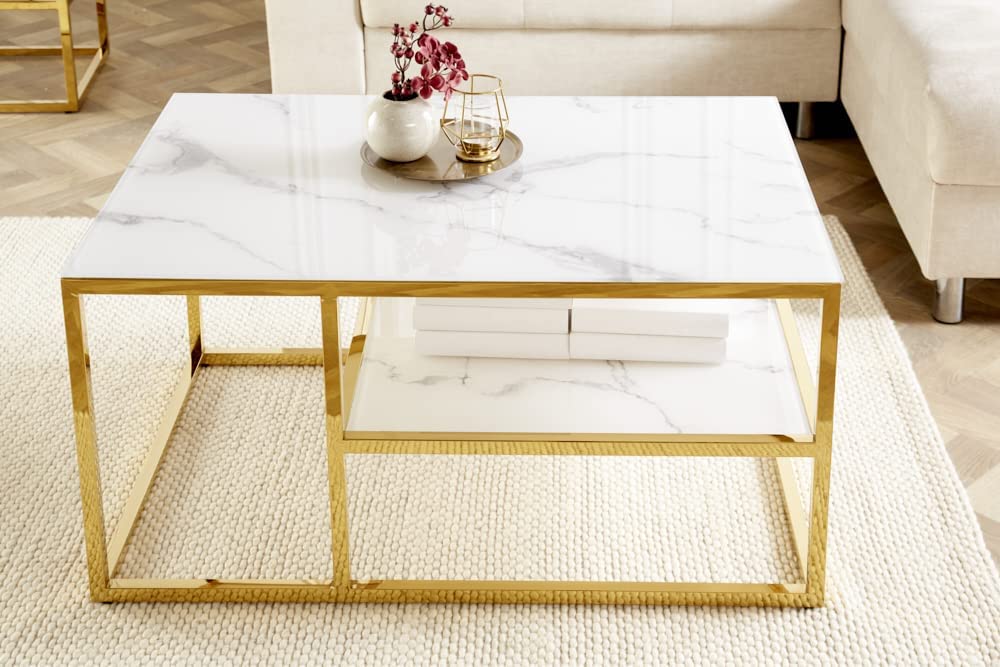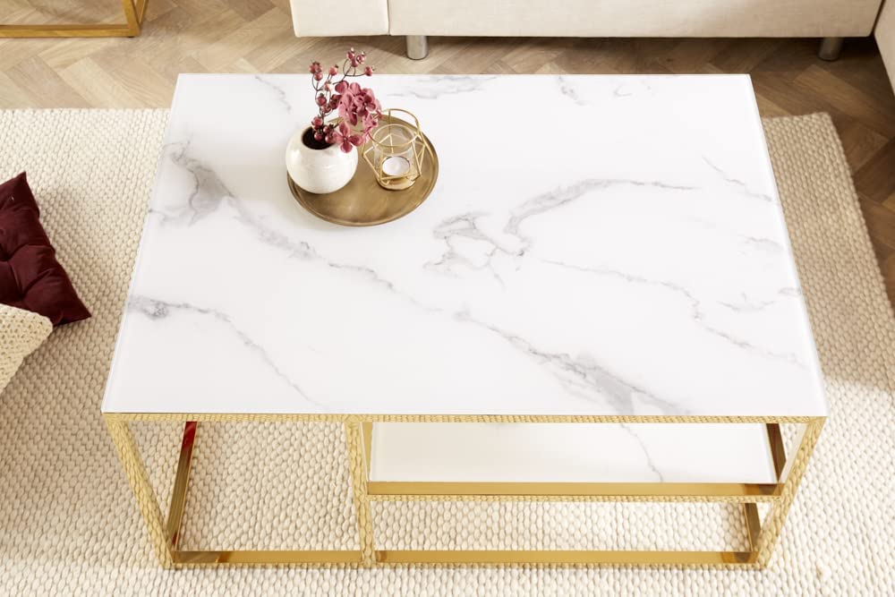 Mit diesem eleganten Couchtisch setzt man glanzvolle Akzente im Wohnzimmer. Das zeitlose Erscheinungsbild der in Marmor-Optik gehaltenen Tischplatten und des goldenen Metallgestells, läßt sich gut mit vielen anderen Einrichtungsstilen kombinieren.