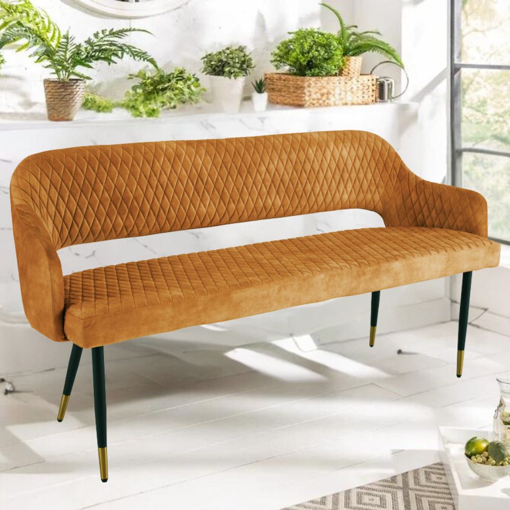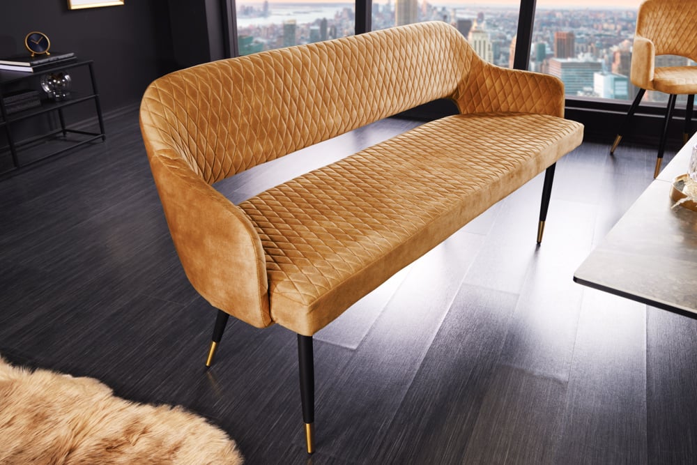 Unsere Sitzbank aus der Serie FRANCE besticht durch ihr schlichtes und elegantes Design, das von den typischen Formen der 50er und 60er Jahre inspiriert ist. Sie hat vier schräge Beine aus pulverbeschichtetem Metall, die ihr einen leichten und luftigen Look verleihen. Die Kombination aus dem senf-gelben Samtbezug und den goldenen Fußkappen schafft einen spannenden Kontrast, der Deinem Wohnzimmer eine moderne und stilvolle Note verleiht. Die Sitzbank passt zu vielen Einrichtungsstilen und lässt sich wunderbar mit den Stühlen der gleichnamigen Serie FRANCE kombinieren.