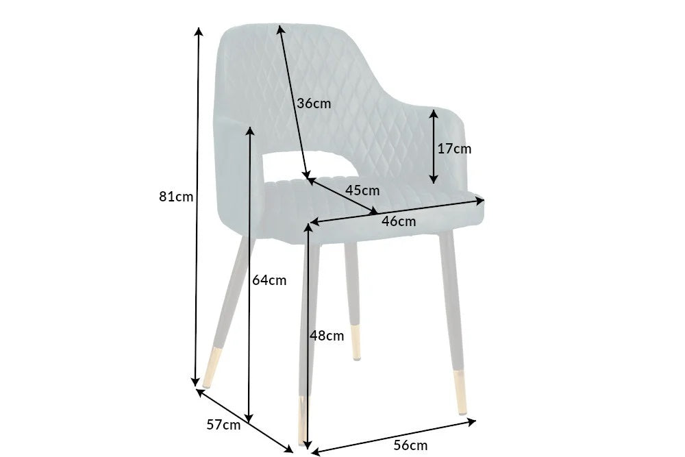 - Maße ca.: 56x81x57cm (BxHxT) - Sitzbreite 46cm - Sitzhöhe 48cm - Sitztiefe 45cm - Höhe Rückenlehne 36cm - Höhe Armlehne 17cm - Abstand Boden/Armlehne 64cm