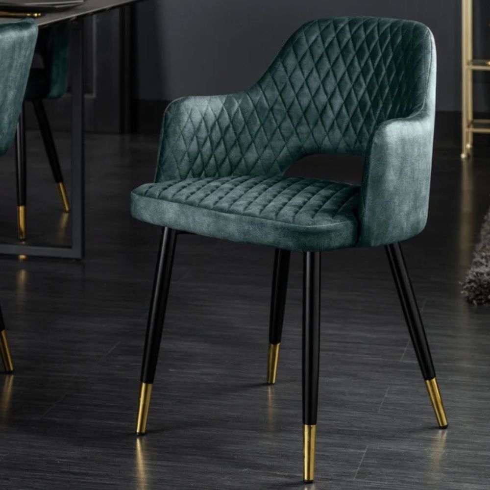 Dieser elegante Stuhl läßt sich toll mit vielen Einrichtungsstilen kombinieren. Der hochwertige Samtbezug ist pflegeleicht und langlebig. Die Ziersteppung und die schwarzen Beine mit den goldenen Fußkappen verleihen einen Hauch von Extravganz.