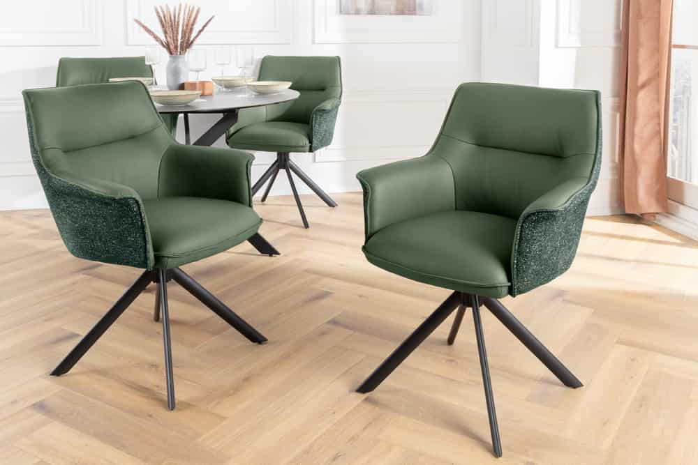 Tauche ein in entspannte Eleganz mit dem drehbaren Stuhl GEORGE in einem modernen Grün – eine perfekte Symbiose aus Echtleder, robustem Strukturstoff und formschönem Metallgestell im Retro-Stil. Die hochwertige Sitzschale lädt mit feinstem Leder innen und widerstandsfähigem Stoff außen zum langen Verweilen ein – luxuriöser Komfort, der auch lange Sitzungen zum Genuss macht.