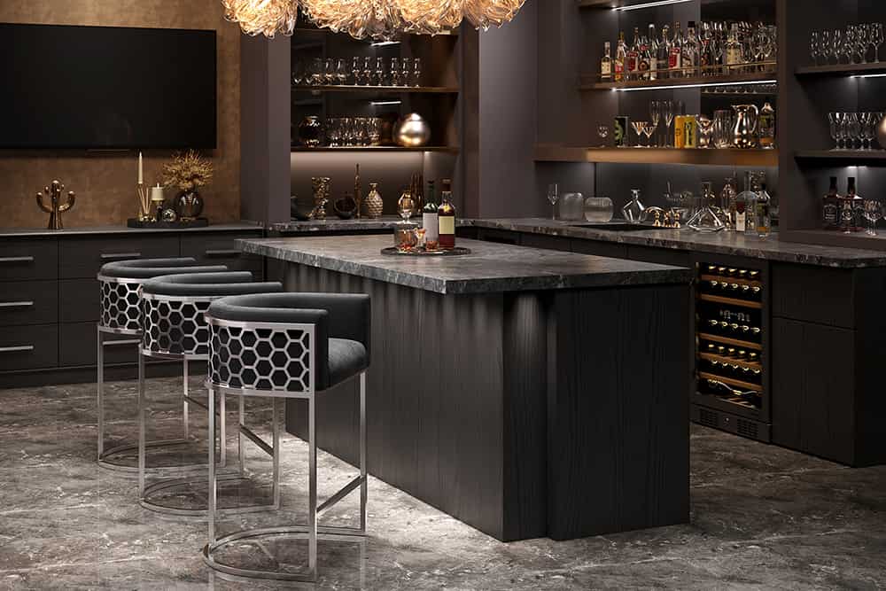 Ergänze mit stilvollen Accessoires: Ein Samtkissen oder ein edler Teppich unter dem Barbereich steigert den Komfort.