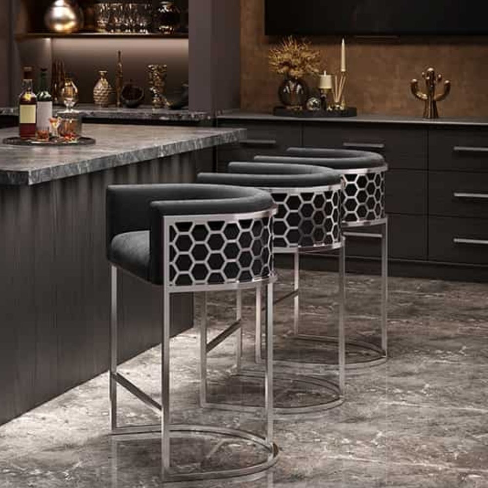 Egal ob in der urbanen Loft-Küche, in der gemütlichen Homebar oder im professionellen Gastro-Umfeld – dieser Hocker macht Eindruck. Der graue Samt fügt sich harmonisch in verschiedenste Farbwelten, während das Silber jene moderne Note setzt, die deinen Raum zum besonderen Erlebnis macht.