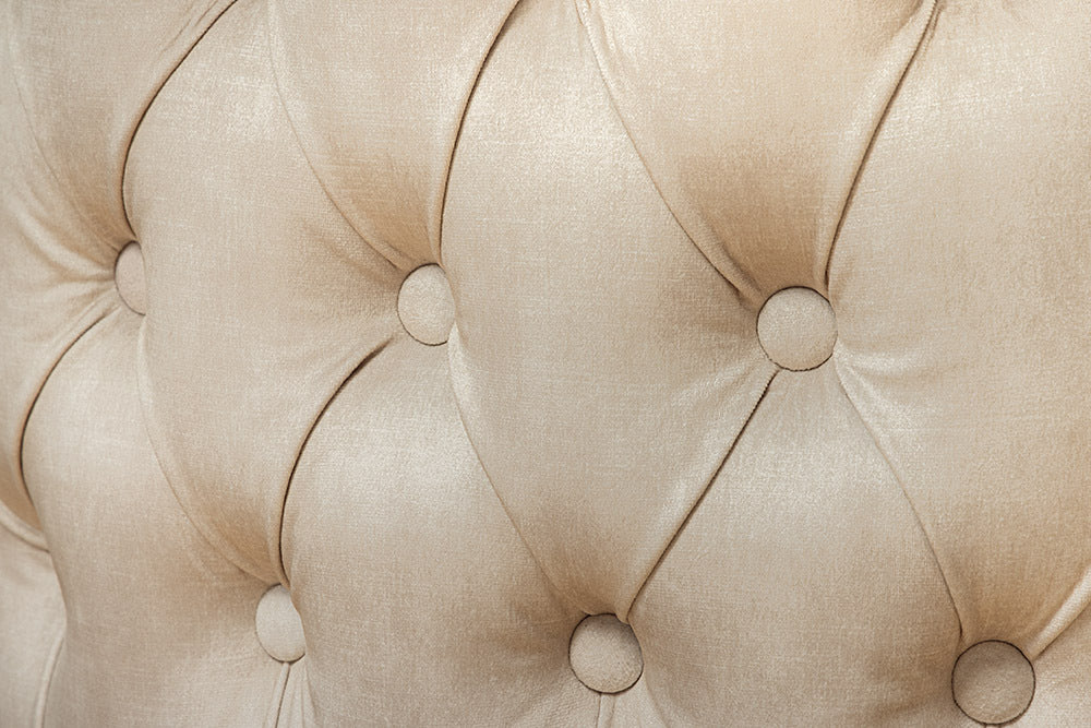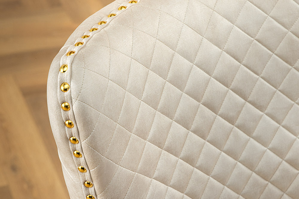 Edles Design: Beiger Samt, goldener Edelstahlfuß, Löwenkopf-Detail – ein echter Blickfang.