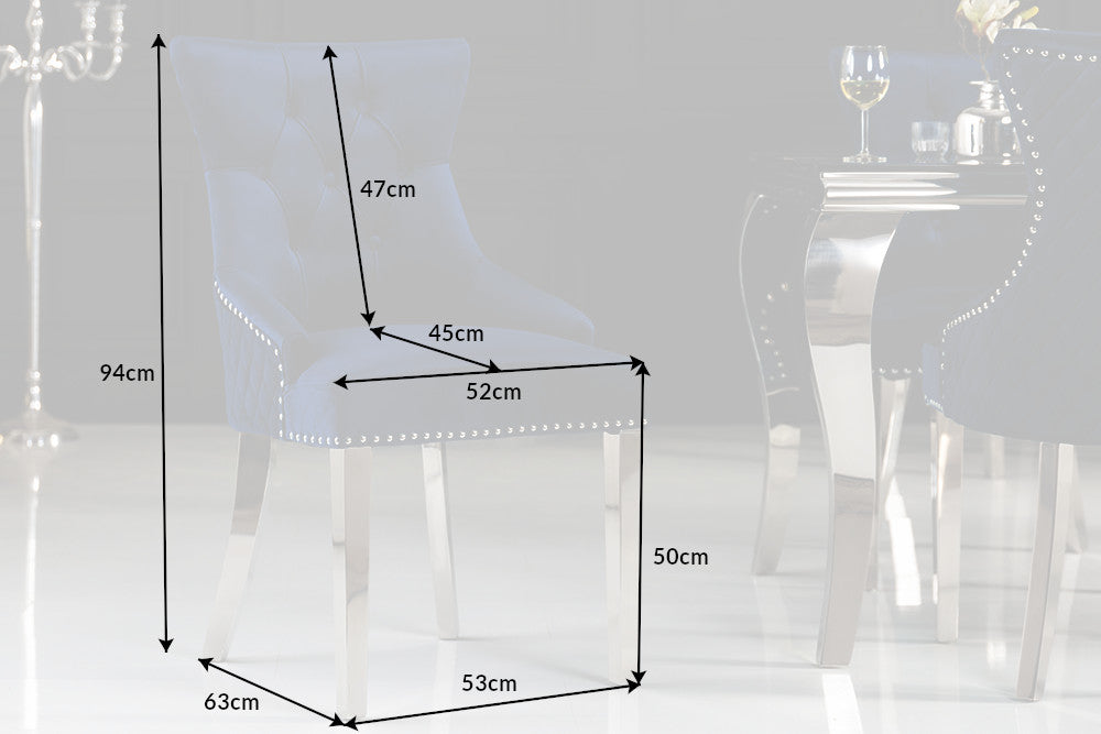 Der extravagante Stuhl aus der Serie LEON vereint höchsten Sitzkomfort mit elegantem Design. Die Klasse des Stuhles wird geprägt durch den hochwertigen Bezugstoff aus Samt und die geschwungenen silbernen Füße aus poliertem Edelstahl. Hinzu kommt der besondere Eyecather in dieser Serie, und zwar der silberne Löwenkopf mit Griff auf der Rückseite des Stuhles.