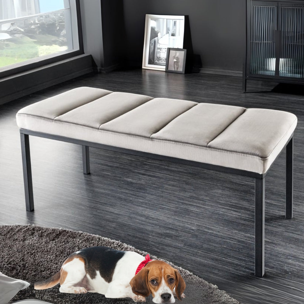 Das skandinavisches Design vereint modernem Flair und edlen Minimalismus. Mit einer Breite von 80 cm ist sie perfekt für kleine Räume oder als zusätzliche Sitzgelegenheit geeignet. Die Sitzbank ist mit einem grauem Samtbezug versehen, der nicht nur optisch ansprechend ist, sondern auch angenehm weich und gemütlich ist. Das schwarze Gestell verleiht der Bank Stabilität und einen modernen Kontrast zum warmen Grau des Bezugs.