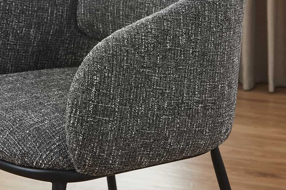 Die leicht geschwungene Rückenlehne mit integrierten Armlehnen sorgt für Komfort bei jeder Gelegenheit – ob beim ausgedehnten Dinner, beim konzentrierten Arbeiten im Homeoffice oder beim entspannten Lesen. -