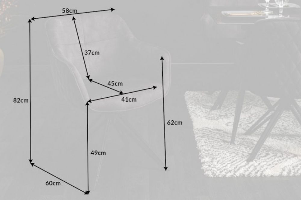 - Maße ca.: 58x82x60cm (BxHxT) - Sitzbreite 41cm - Sitzhöhe 49cm - Sitztiefe 45cm - Höhe Rückenlehne 37cm - Höhe Armlehne 17cm - Abstand Boden/Armlehne 62-68cm