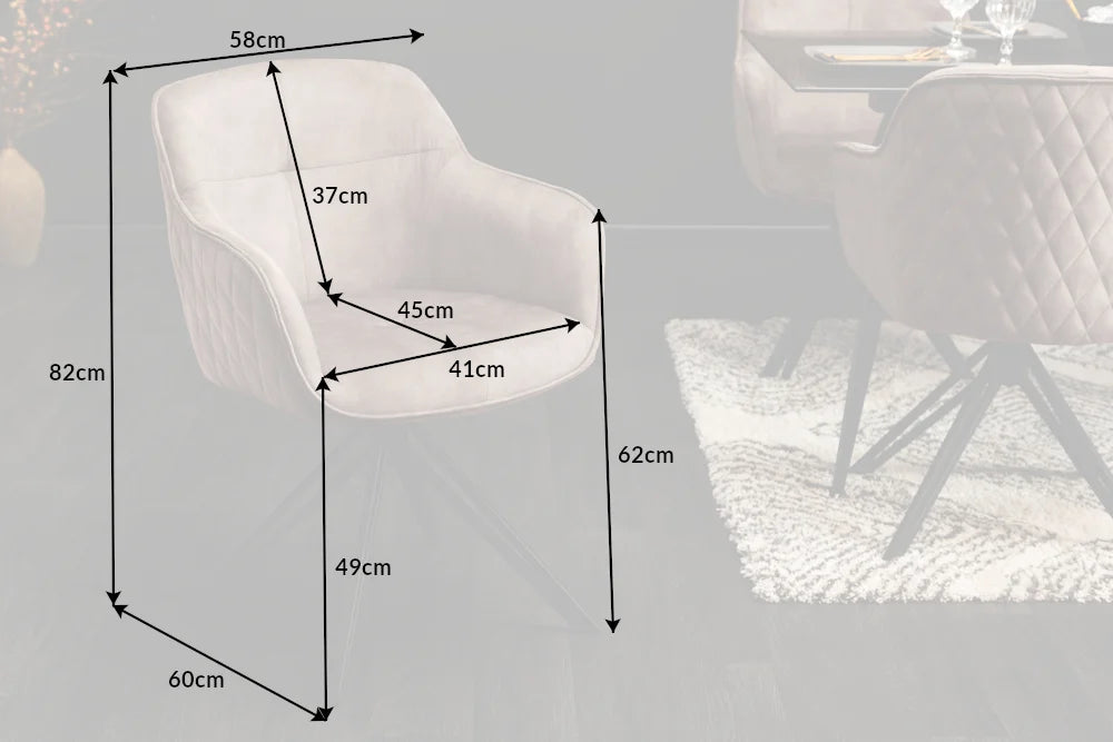 - Maße ca.: 58x82x60cm (BxHxT) - Sitzbreite 41cm - Sitzhöhe 49cm - Sitztiefe 45cm - Höhe Rückenlehne 37cm - Höhe Armlehne 17cm - Abstand Boden/Armlehne 62-68cm