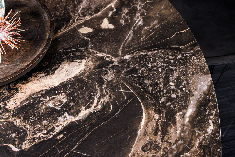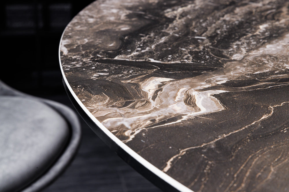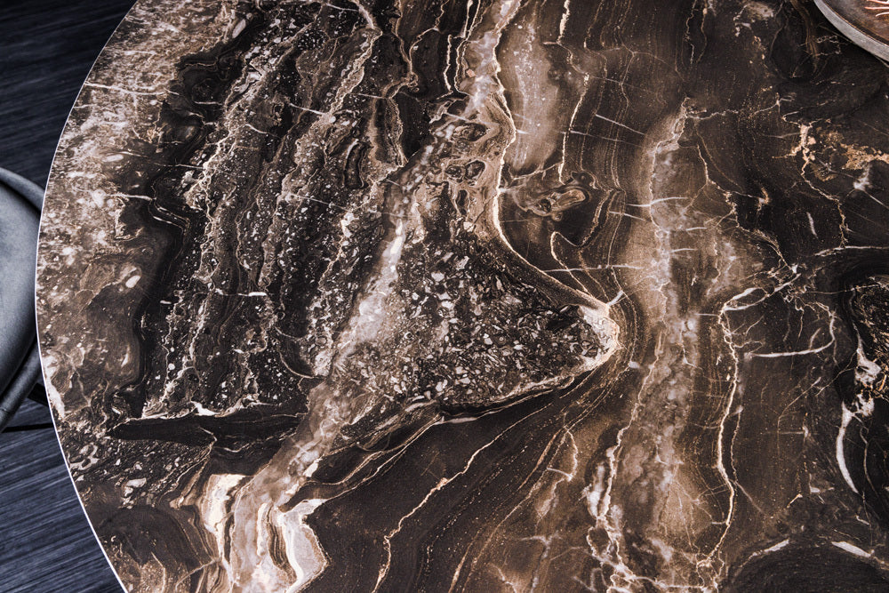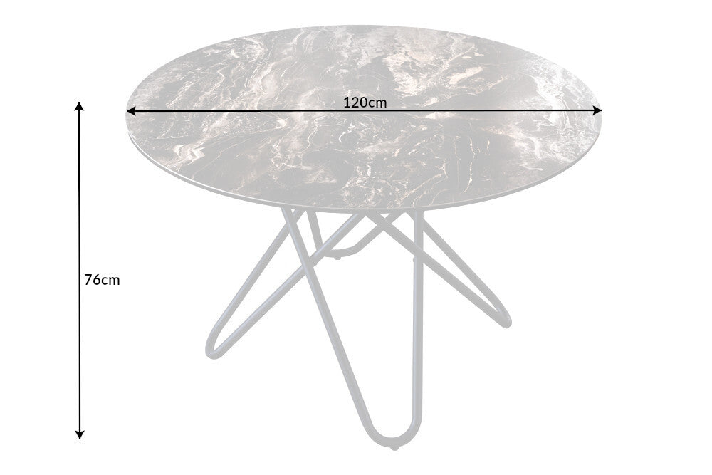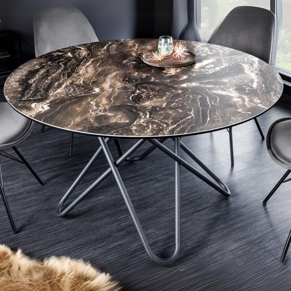 Verleihe Deinem Esszimmer mit unserem runden Esstisch PARMA einen Hauch von moderne Eleganz. Die Tischplatte aus hochwertiger Keramik und in einem extravagantem Design überzeugt durch ihre elegante Optik und strapazierfähige Oberfläche. Das schwarze Metallgestell mit Hairpin Legs verleiht dem Tisch einen stabilen Stand und unterstreicht den ganz besonderen Look.