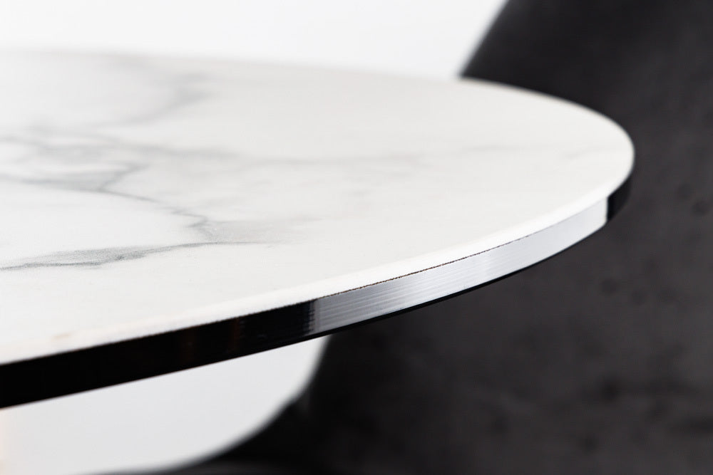 Verleihe Deinem Esszimmer mit unserem runden Esstisch PARMA einen Hauch von zeitloser Eleganz. Die Tischplatte aus hochwertiger Keramik in weissem Marmor-Design überzeugt durch ihre elegante Optik und strapazierfähige Oberfläche. Das schwarze Metallgestell mit Hairpin Legs verleiht dem Tisch einen stabilen Stand und unterstreicht den ganz besonderen Look.