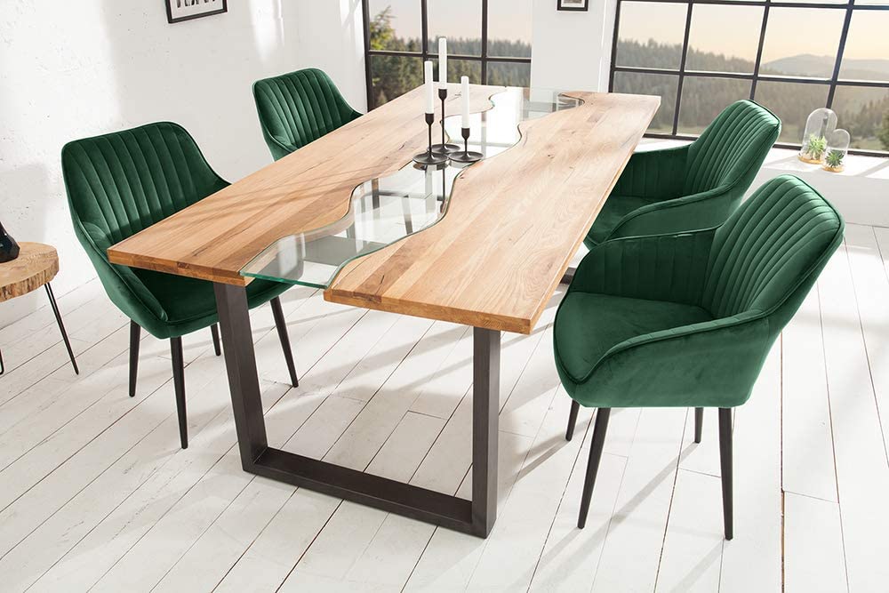 Dieser edle Stuhl im Retro-Stil läßt sich toll mit vielen Einrichtungsstilen kombinieren. Der Samtbezug und die Ziersteppung verleihen einen Hauch von Extravganz. Die stabilen Metallbeine und die gemütlich gepolsterten Armlehnen vermitteln ein komfortables Sitzerlebnis.