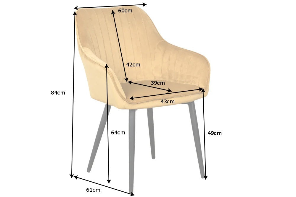 - Maße ca.: 60x84x61cm (BxHxT) - Sitzbreite 43cm - Sitzhöhe 49cm - Sitztiefe 39cm - Höhe Rückenlehne 42cm - Höhe Armlehne 19cm - Abstand Boden/Armlehne 64cm