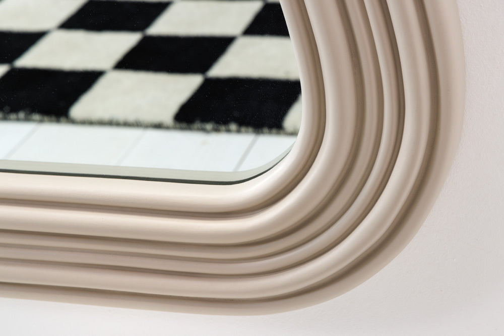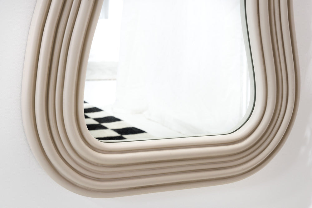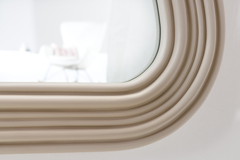 Mit dem Wandspiegel DIVINA zieht ein echter Hingucker bei Dir ein! Der Spiegel besticht mit einem Rahmen im asymmetrischen Design in hellem Pastell-Greige. Der Pastell-Spiegel ist ein perfektes Wohnaccessoire, um jedem Raum eine zusätzliche Tiefe und Helligkeit zu verleihen. Das gestufte Design des Rahmens ist ein verspieltes Detail und die Pastell-Farbe sorgt für ein freundliches Ambiente – egal ob im Flur oder im Schlafzimmer!