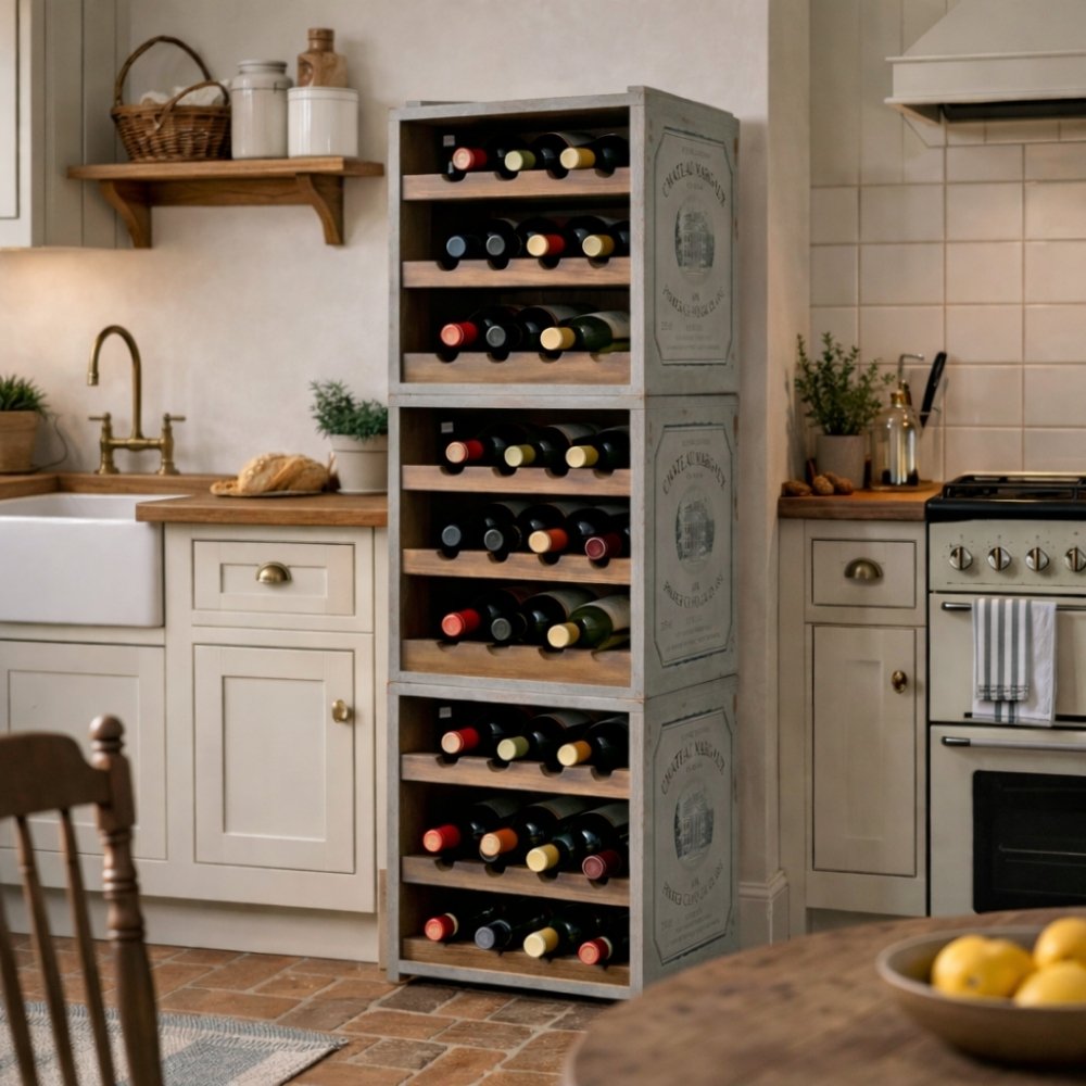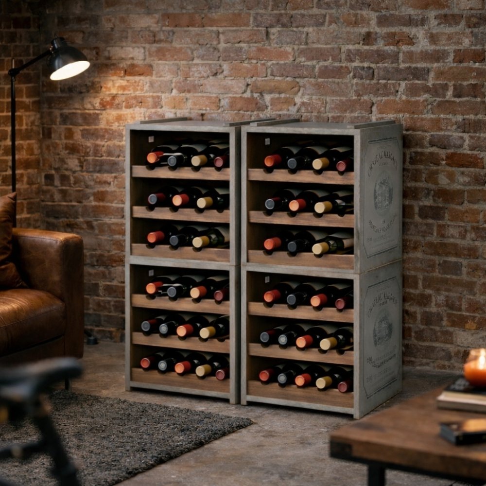 Die integrierten Ablagen bieten Platz für mehrere Weinflaschen und sorgen für eine sichere, liegende Lagerung. Die massive Konstruktion verleiht dem Regal Stabilität und Wertigkeit.