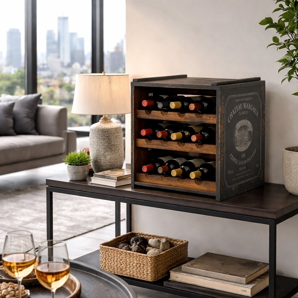 Mit seinen kompakten Maßen eignet sich SURAT ideal als stilvolles Weinregal, Beistelltisch oder dekoratives Stauraumelement im Wohn- oder Essbereich.
