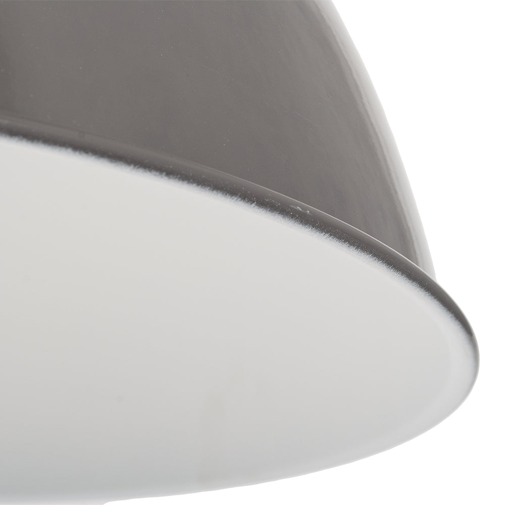 Der Lampenschirm ist aus Metall gefertigt und ist innen weiß und außen in Grau lackiert.