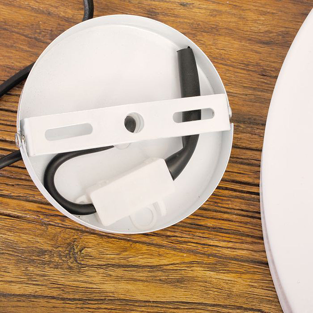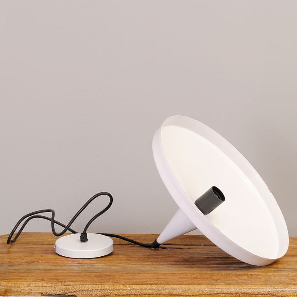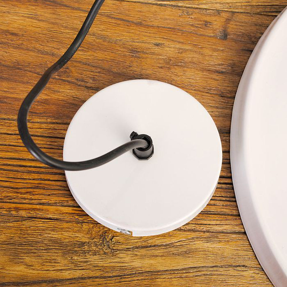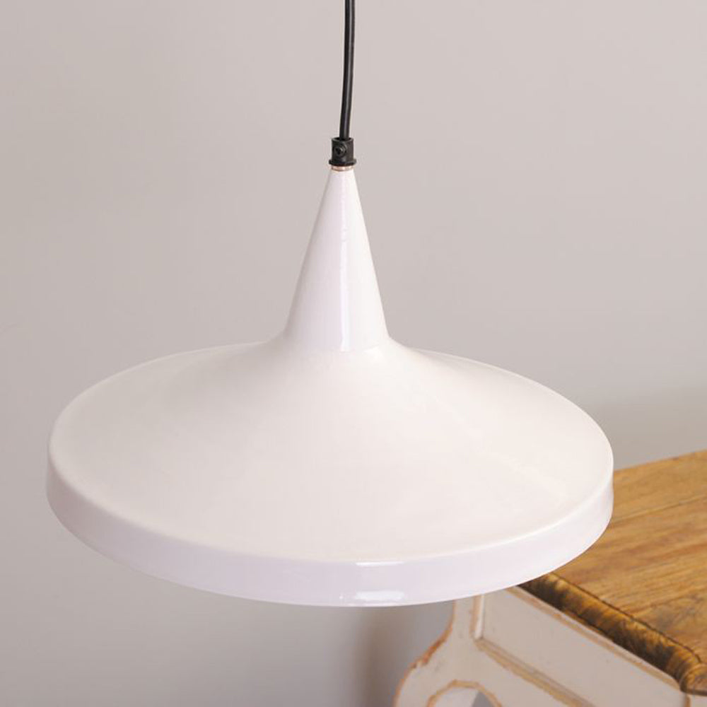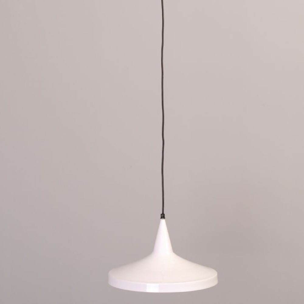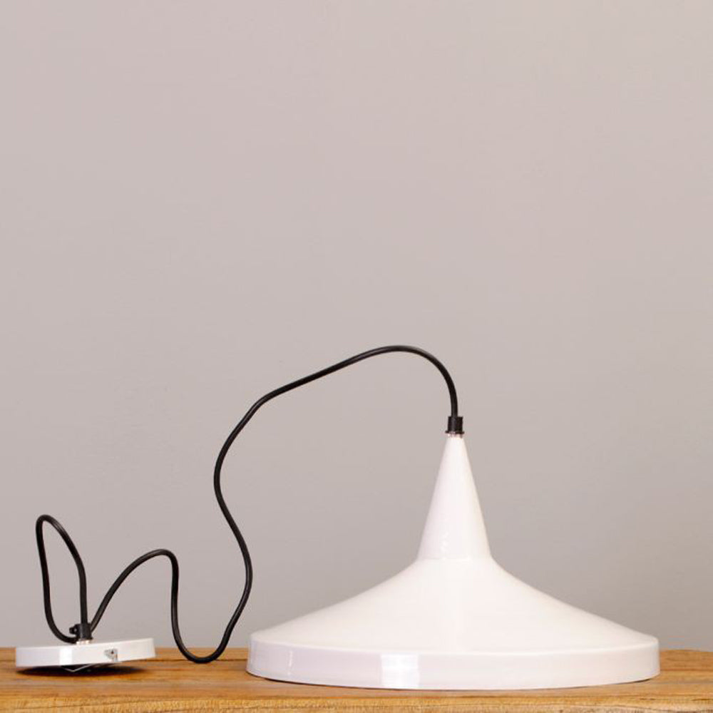 Minimalistische Leuchte im Industrie-Design. Der Lampenschirm ist aus Metall gefertigt und wurde außen und innen in weiß lackiert. Zur Anbringung an der Decke wird die Lampe mit einem Baldachin geliefert, der in der gleichen Farbe wie die Leuchte lackiert ist. Diese Leuchte passt am besten in moderne, eher puristisch eingerichtete Räumlichkeiten.