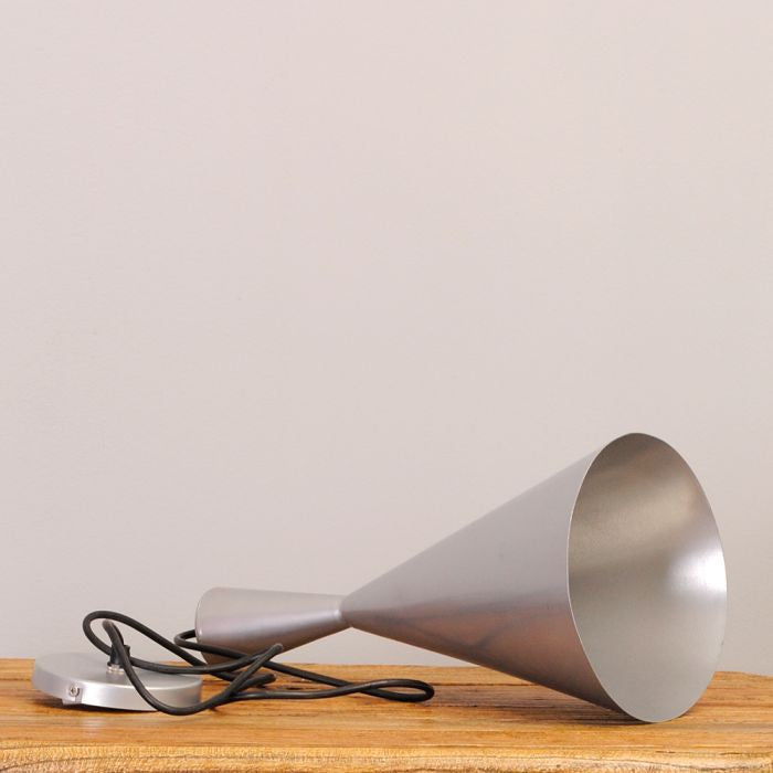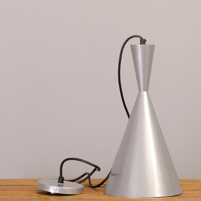 Minimalistische Leuchte im Industrie-Design. Der Lampenschirm ist aus Metall gefertigt und wurde außen und innen in silber lackiert.