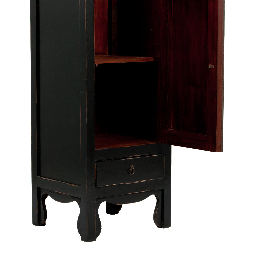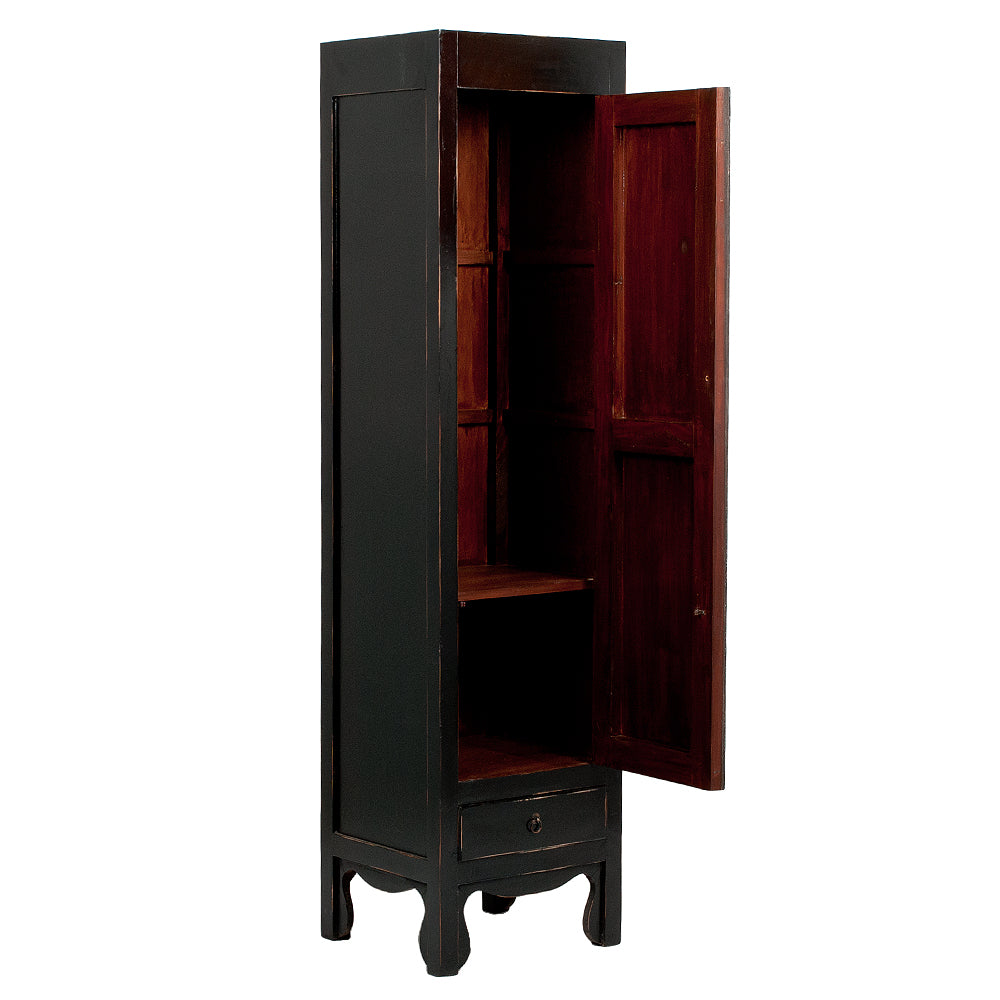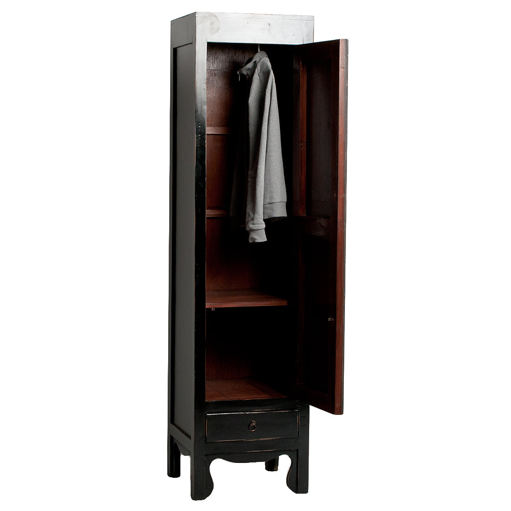 Der edle Hochzeitsschrank ASIA-SLIM bietet Ihnen exklusives Design in Vollendung. Jeder dieser Schränke im traditionell asiatischen Stil wird in Handarbeit gearbeitet und damit zum echten Unikat. Hinter der Tür und der Schublade verbirgt sich viel Stauraum für ihre Mode und Accessoires. Der Innenraum ist in zwei Ablageflächen unterteilt. An der abnehmbaren Kleiderstange kann man Kleidungsstücke aufhängen. Dieser Schrank ist ein garantierter Blickfang und wird Ihr Ambiente in stilvoller Weise aufwerten. Der dekorative Verschluss mit Riegel an der Vorderseite wertet das Gesamtbild auf.