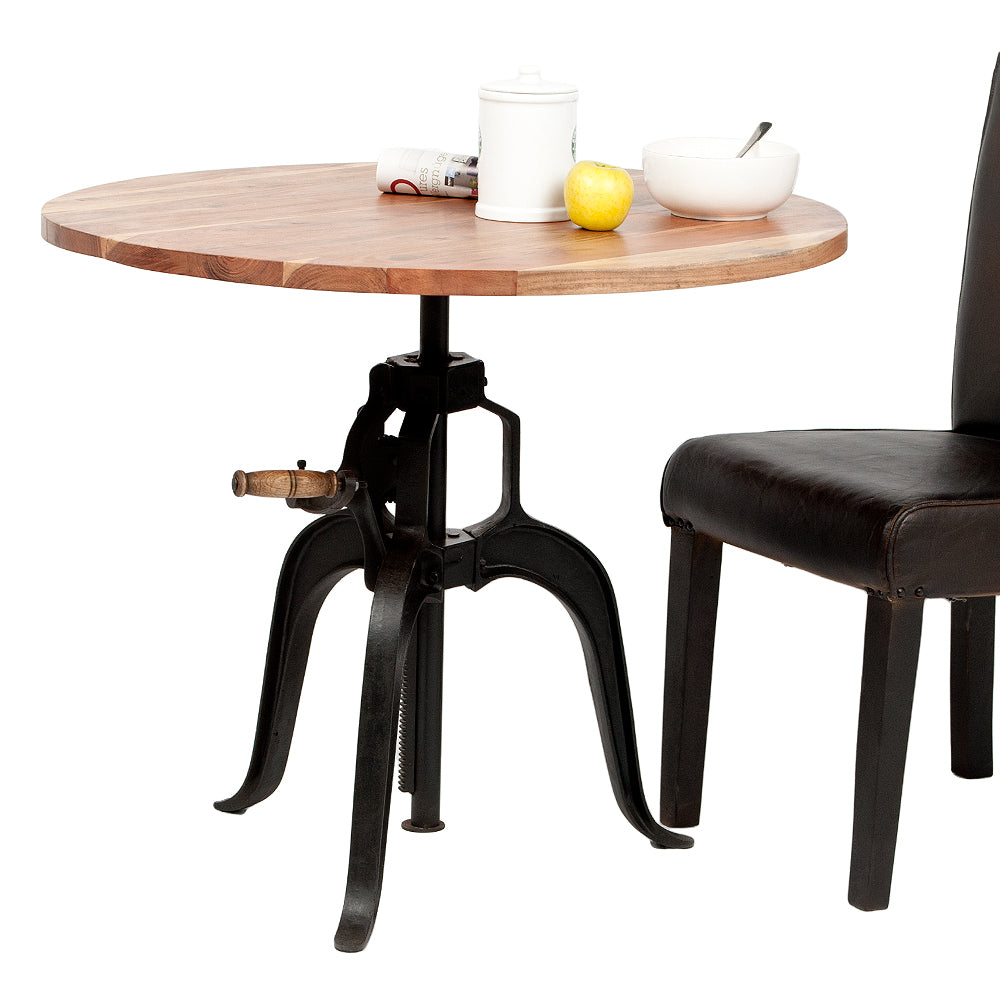 Innovativ, massiv und einzigartig. Der exklusive Esstisch ROUND ist ein absoluter Hingucker, egal ob im Wohnzimmer, Esszimmer oder in einer anderen Räumlichkeit. Mittels einer Kurbel, angebracht am schweren Gusseisen-Gestell, läßt sich auf Wunsch die massive Akazie-Tischplatte in der Höhe verstellen und dort fixieren. Die kernige Gesamtoptik, die einzigartige Maserung und warme Ausstrahlung dieses robusten Holzes wird Sie begeistern. Wohlfühl-Ambiente für Ihr Wohnzimmer oder Esszimmer.