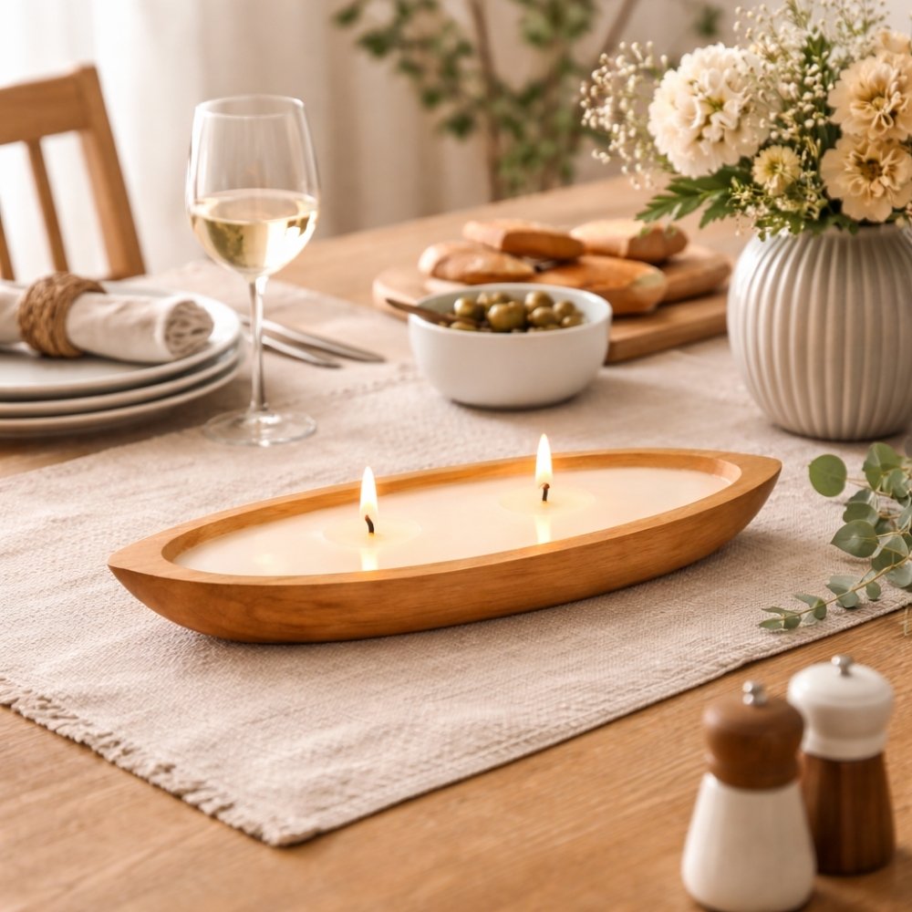 Wie ein ruhiger Moment am Wasser wirkt das CERO-Boat: langgezogen, harmonisch und reduziert – und genau deshalb so besonders. Die sanfte Flamme spiegelt sich im hellen Wachs, während das massive Teakholz mit seiner lebendigen Maserung Wärme und Natürlichkeit ausstrahlt. Ob auf einem Kaminsims, auf einem Sideboard oder auf einem Tablett im Badezimmer – diese Kerzenschale schafft Atmosphäre, ohne sich aufzudrängen.