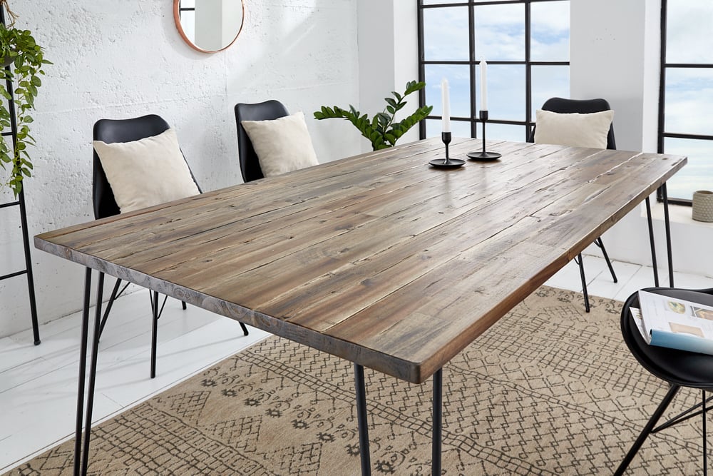 Esstisch ALINA besticht durch die lebendig scheinende Oberfläche der massiven Akazienholz-Tischplatte. Dieser massive Tisch im Retro-Look ist immer ein Eycatcher.