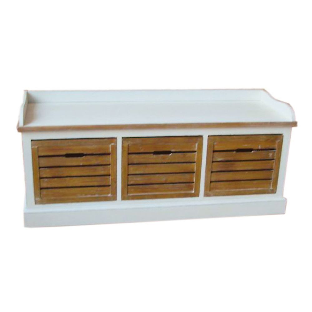 Beim ersten Blick fällt die edle Formensprache und die hochwertige Verarbeitung ins Auge. Die geschwungenen Linien und die detailreiche Schnitzarbeit verleihen der Bank einen unverwechselbaren Charme im Landhausstil. Die drei geräumigen Körbe bieten jedoch nicht nur dekoratives Flair, sondern auch jede Menge Stauraum für Decken, Kissen oder andere Wohnaccessoires.