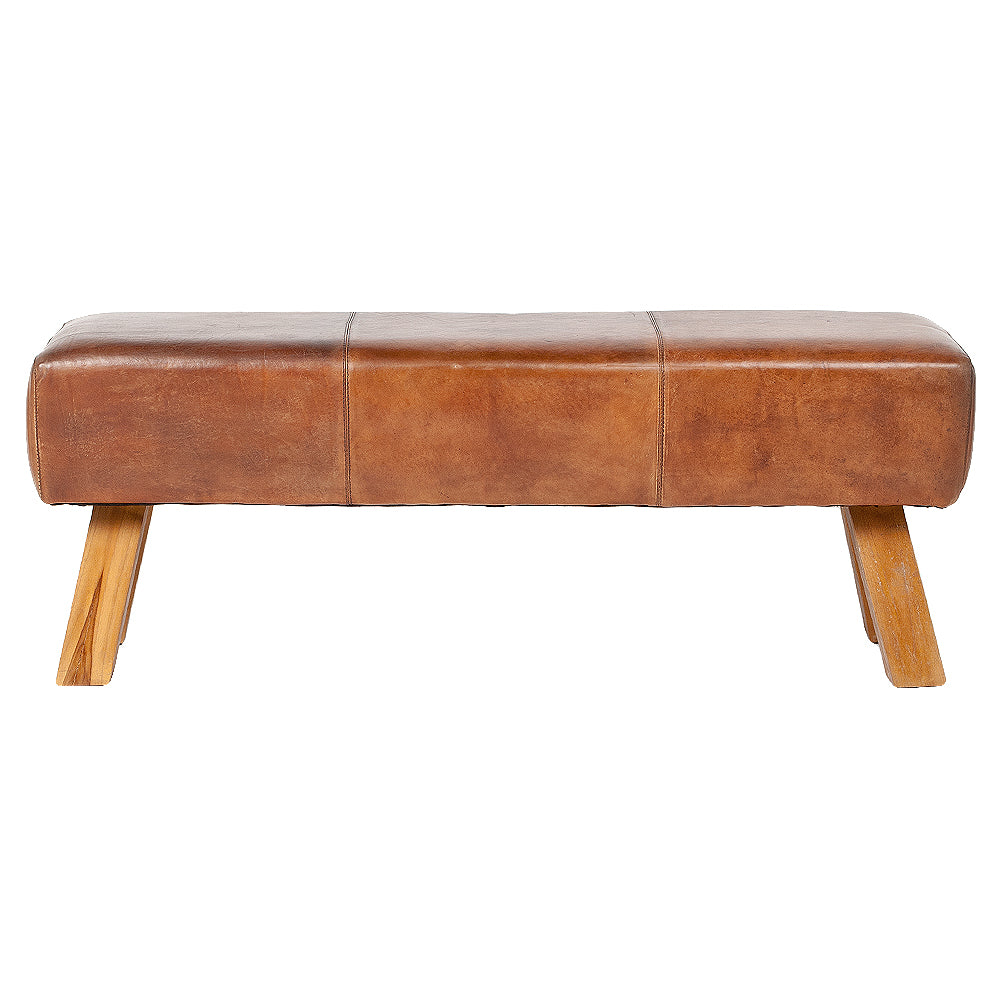 Leder Bank MAXI-L im Design eines Turnbock's. Das Gestell wurde aus massivem Teak gefertigt, die Bank ist mit Echtleder (Ziege) bezogen. Diese formschöne Bank ist für jeden Wohnbereich ein absolutes Highlight.