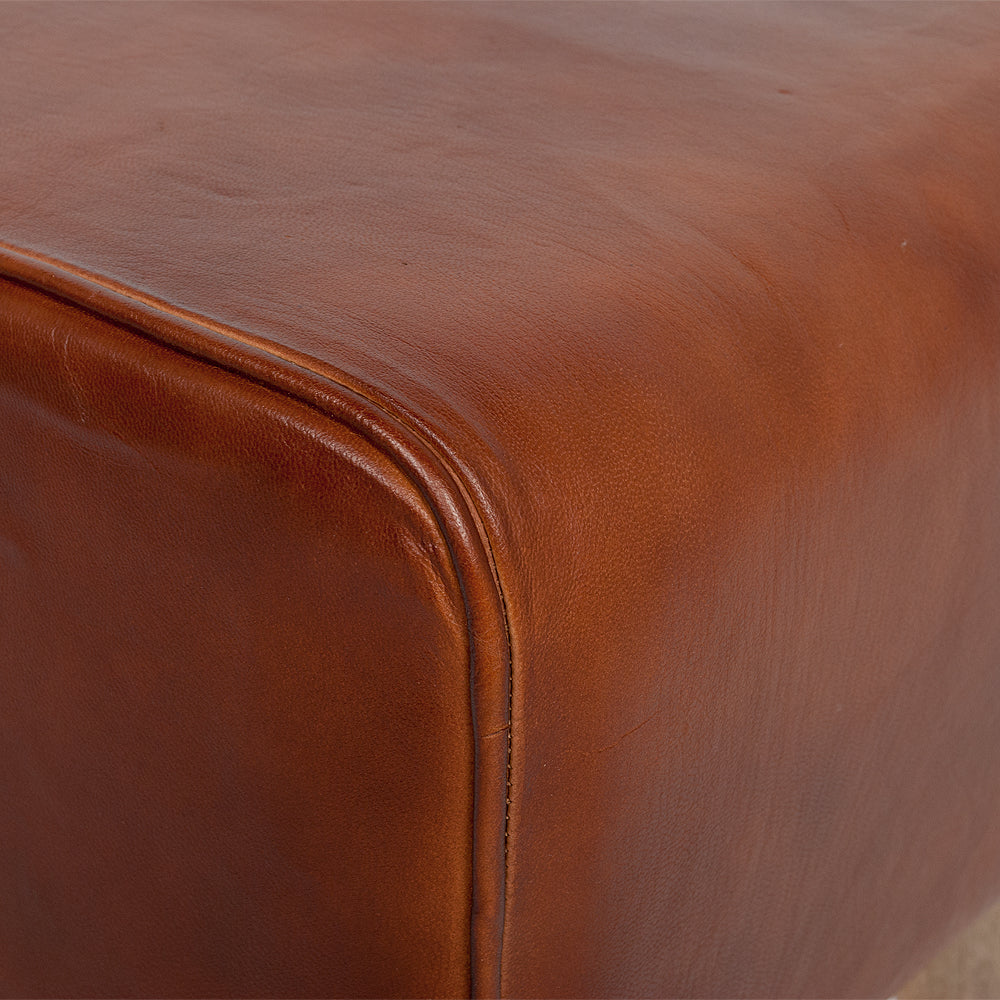 Leder Sitzbank MAXIMO in der Form eines Turnbocks. Das Gestell wurde aus Massivholz gefertigt, die Bank ist mit Echtleder bezogen. Diese stylische und zugleich formschöne Sitzbank ist für jeden Wohnbereich und in jeder Umgebung ein absolutes Highlight.