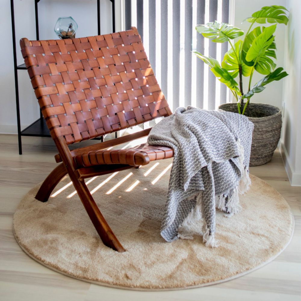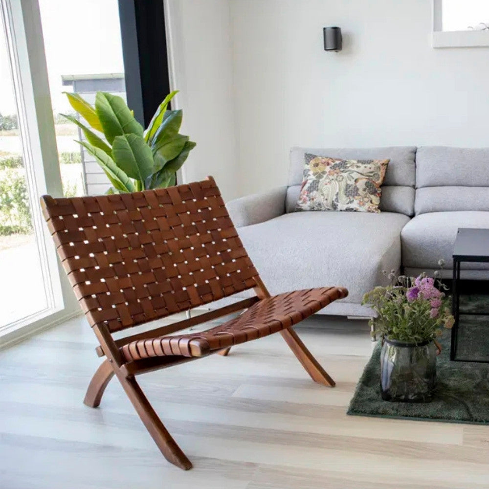 Formschöner und bequemer Stuhl aus Teak & Leder in Braun.