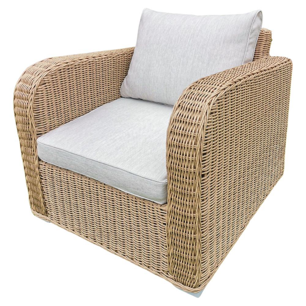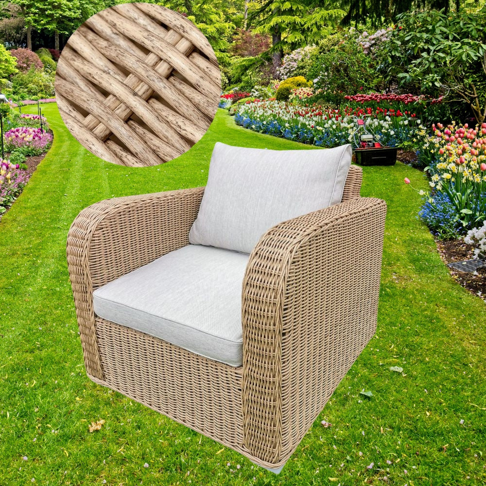 Der bequeme Lounge Sessel VITA lädt zu gemütlichen Verweilen z.B. im Garten, dem Balkon oder auf der Terrasse ein. Das Grundgestell besteht aus rostfreiem Aluminium, dadurch ist neben der nötigen Stabilität auch ein geringes Gesamtgewicht gewährleistet. Das Geflecht ist aus rundem Polyrattan. Im Gegensatz zu dem meist verwendeten flachen Rattan ist das runde Polyrattan widerstandsfähiger. Die passende wasserabweisende Sitzauflage und Kissen sind inklusive und rundes das stimmige Gesamtdesign ab.