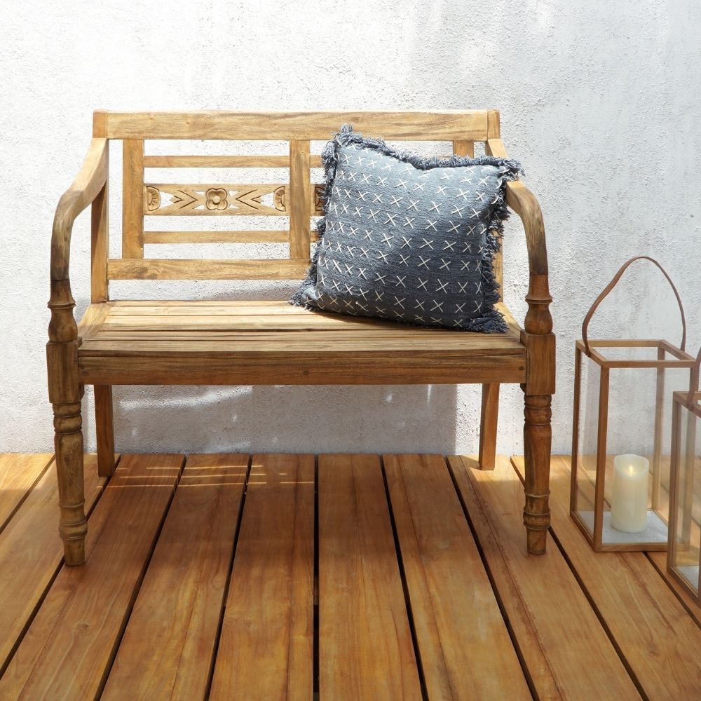 Das Holz dieser Sitzbank wird bei der Produktiont sorgfältig mit feinem Schleifpapier bearbeitet und anschließend chemisch behandelt, um eine gleichmäßige Farbgebung zu erzielen. Mit der Zeit bildet sich auf dem Teakholz die charakteristische silbergraue Patina, die diesem Material seinen besonderen Charme verleiht. Wenn Du den ursprünglichen Farbton wieder hervorheben möchtest, kannst Du die Patina einfach abschleifen – und schon sieht Deine Outdoor-Bank wieder wie neu aus!