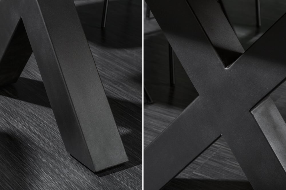 Das X-Gestell in elegantem Schwarz verleiht dem Esstisch einen modernen und zeitlosen Look, der zu nahezu jedem Einrichtungsstil passt. Die Baumkante an den Seiten der Tischplatte verleiht dem Tisch außerdem einen natürlichen und rustikalen Charme.