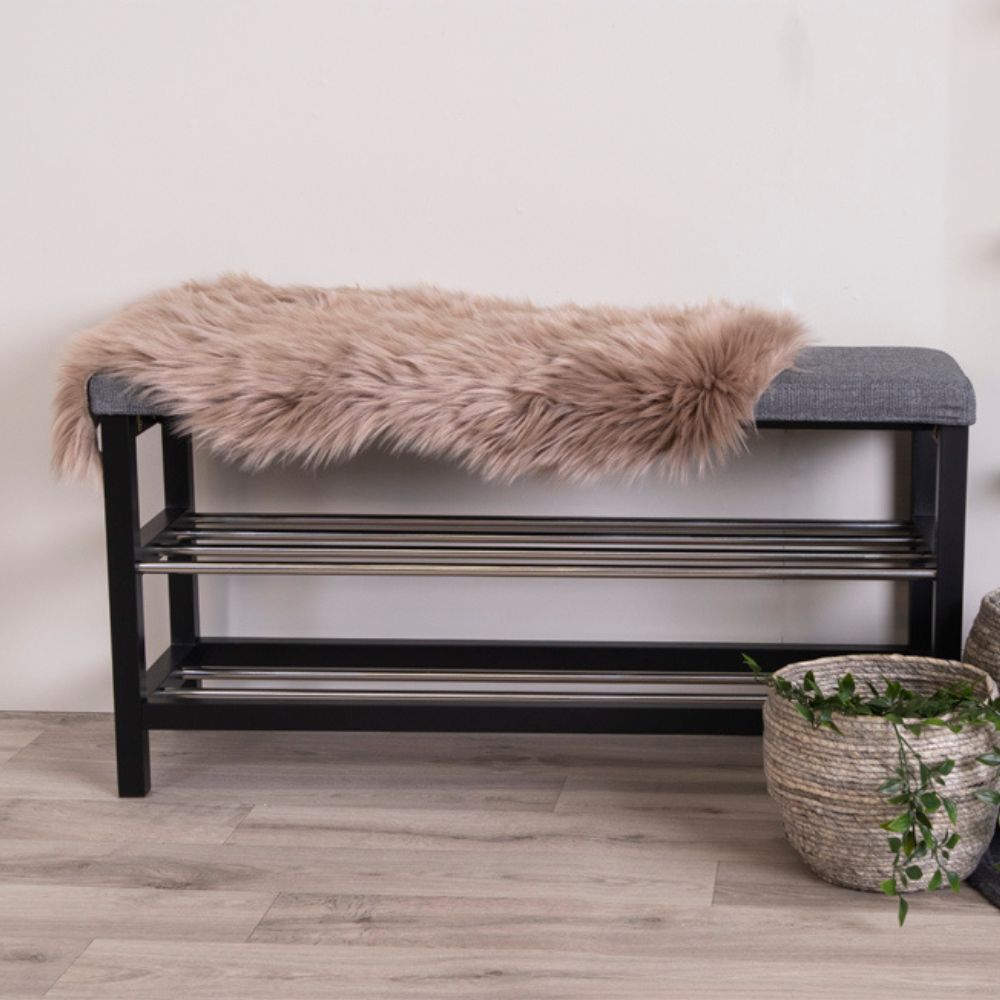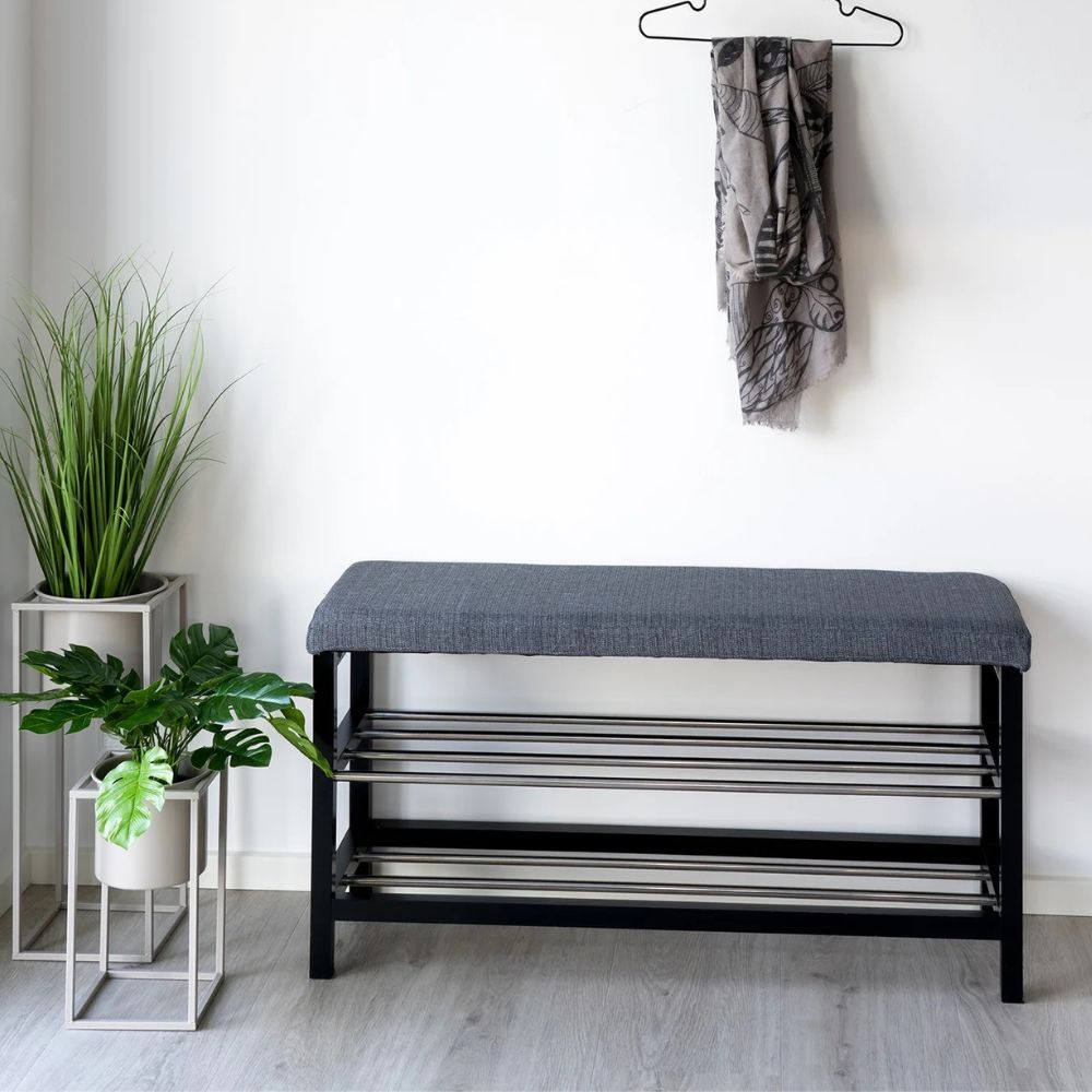 Moderne Sitzbank mit Kissen und 2 Ablegeböden für z.B. Schuhe.